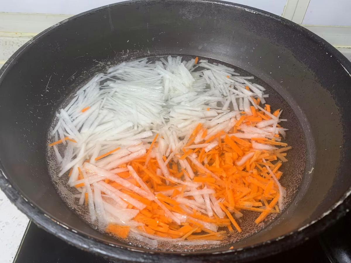 具體做法:1、先把白蘿蔔外皮削掉薄薄的一層,然後切成蘿蔔片,再改刀切成蘿蔔絲。接下來胡蘿蔔同樣也削皮後切成細絲,把切好的胡蘿蔔絲和白蘿蔔絲放入鍋中,大火燒開後燙30秒,撈出過涼水,控幹水分。