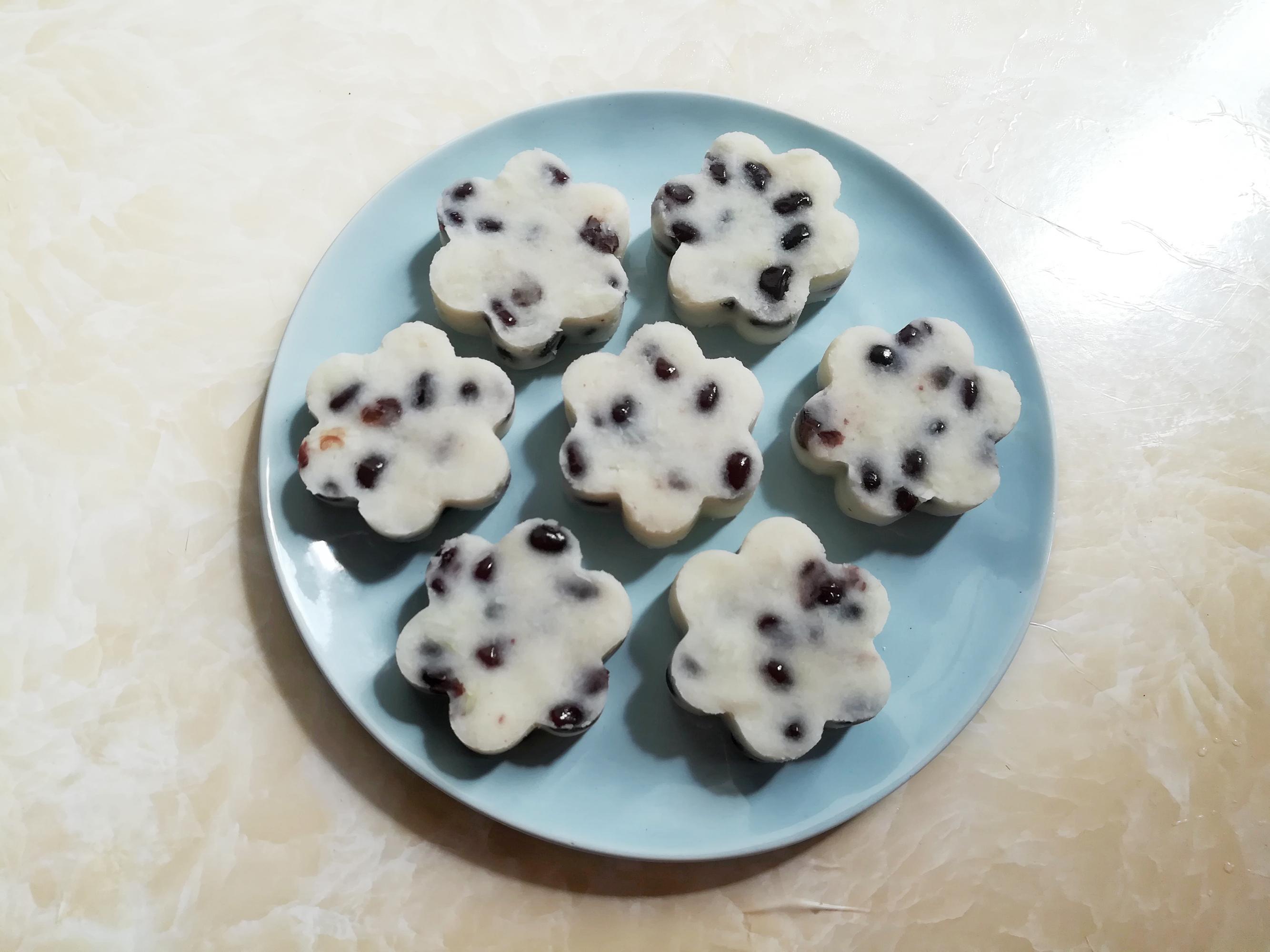 取適量的紅豆山藥泥,放入花朵形狀的模具中抹平壓成型。如果沒有模具,可以用一次性紙杯,剪掉杯子底部,放入紅豆山藥泥,壓平後抽出來,就是圓形的了。