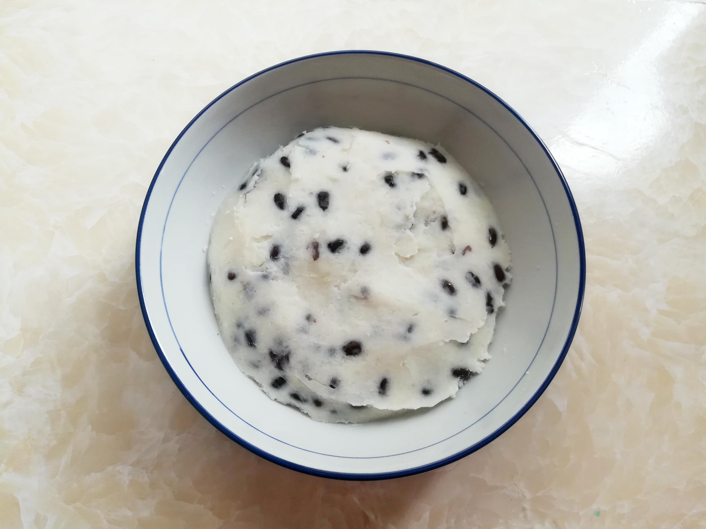 把山藥泥和紅豆混合均勻。山藥本身有一些甜味,紅豆用糖醃過,就不需要額外加糖了。