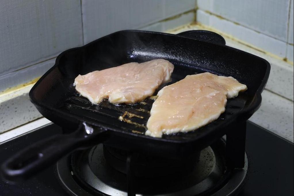 雞胸肉切成薄薄的片,這樣更好入味,煎的時候也更好熟透。還可以用擀麪杖捶打一下,然後放上鹽、胡椒粉、蛋清、澱粉,醃製1個小時以上,反正時間越長越入味。之後鍋中倒入食用油,下入雞排開始煎,煎到兩面金黃,出鍋開喫。