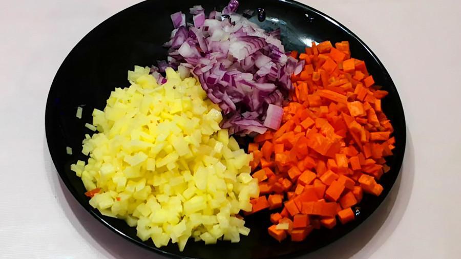 3.趁蒸小米的時候,我們再準備一下配菜:小蔥一棵切蔥花,蔥白和葉子要單獨分開放;再取適量的土豆、洋蔥和胡蘿蔔分別切成小塊,量根據自己炒的小米量決定,主要是爲了提味和搭配顏色好看,也可以換成自己喜歡喫的其它蔬菜。