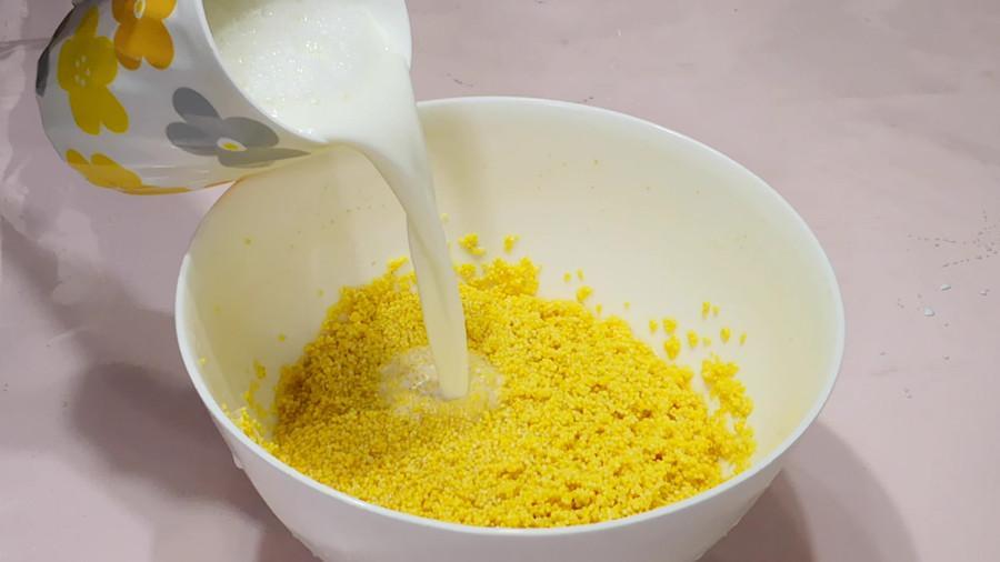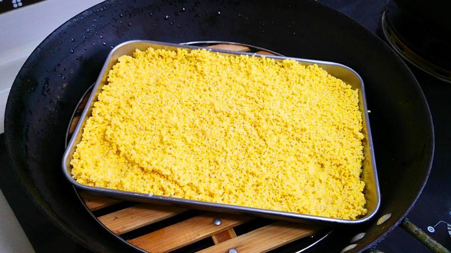 2.然後取一個蒸盤,將小米倒入後攤平,再加入適量的牛奶,比例約爲1:1,接着將其放到蒸鍋中蒸20分鐘左右,把小米蒸熟。蒸小米時用牛奶蒸比用清水蒸更香更好喫,不但有米香味,還有着濃濃的奶香味。
