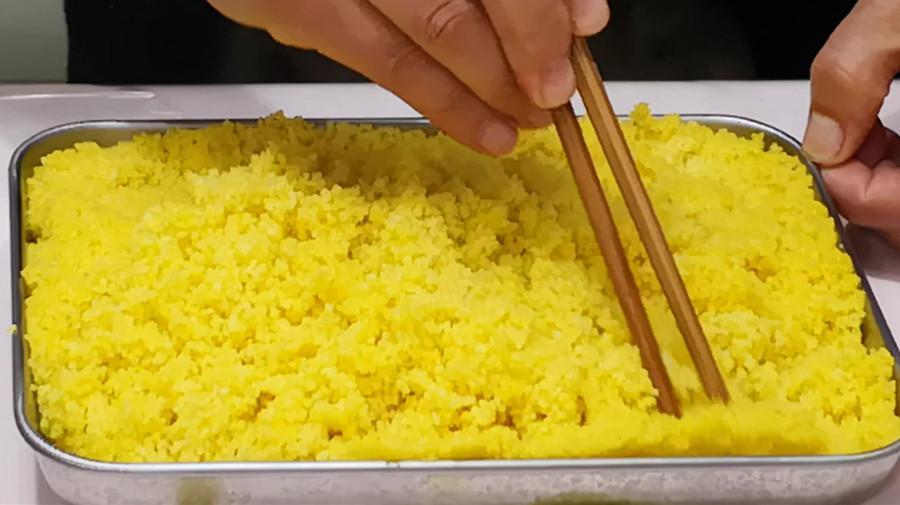 4.小米蒸熟後關火,取出趁熱扒拉開攪散,只要牛奶加得合適,小米就會很容易攪散的;如果攪不散,可以放到冰箱中冷凍片刻再攪拌,這樣小米飯會特別鬆散了。但是注意冷凍時間不要太久,避免凍成硬疙瘩後反而攪不開了。