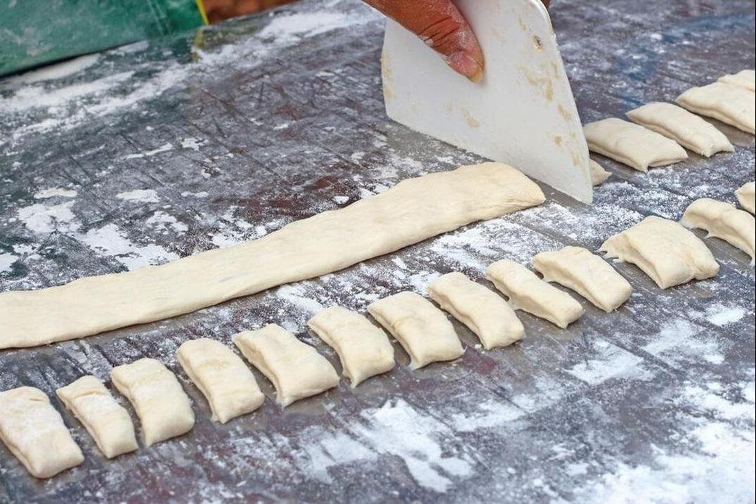 4、不要揉,直接放在提前撒上乾麪粉的案板上,然後將其抻長,用擀麪杖擀一下,擀成厚1cm的長條,再用刀切成細條。切的時候要切成雙數,然後再每兩條疊在一起,中間用筷子壓一下,讓其更牢固。