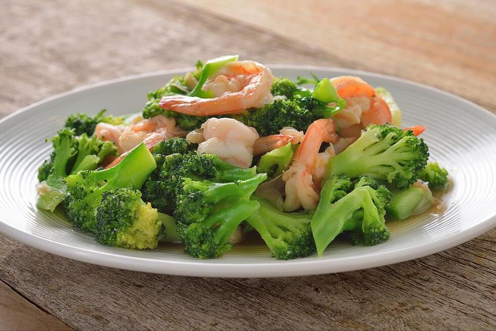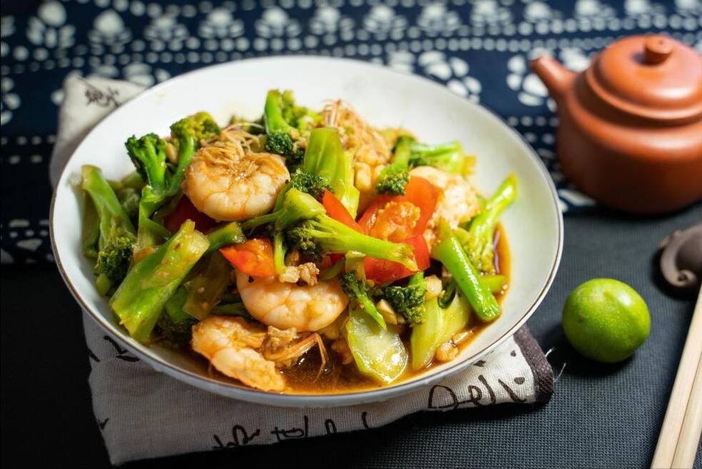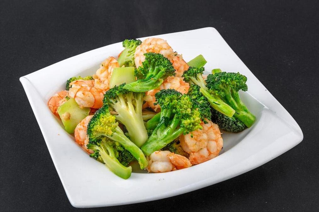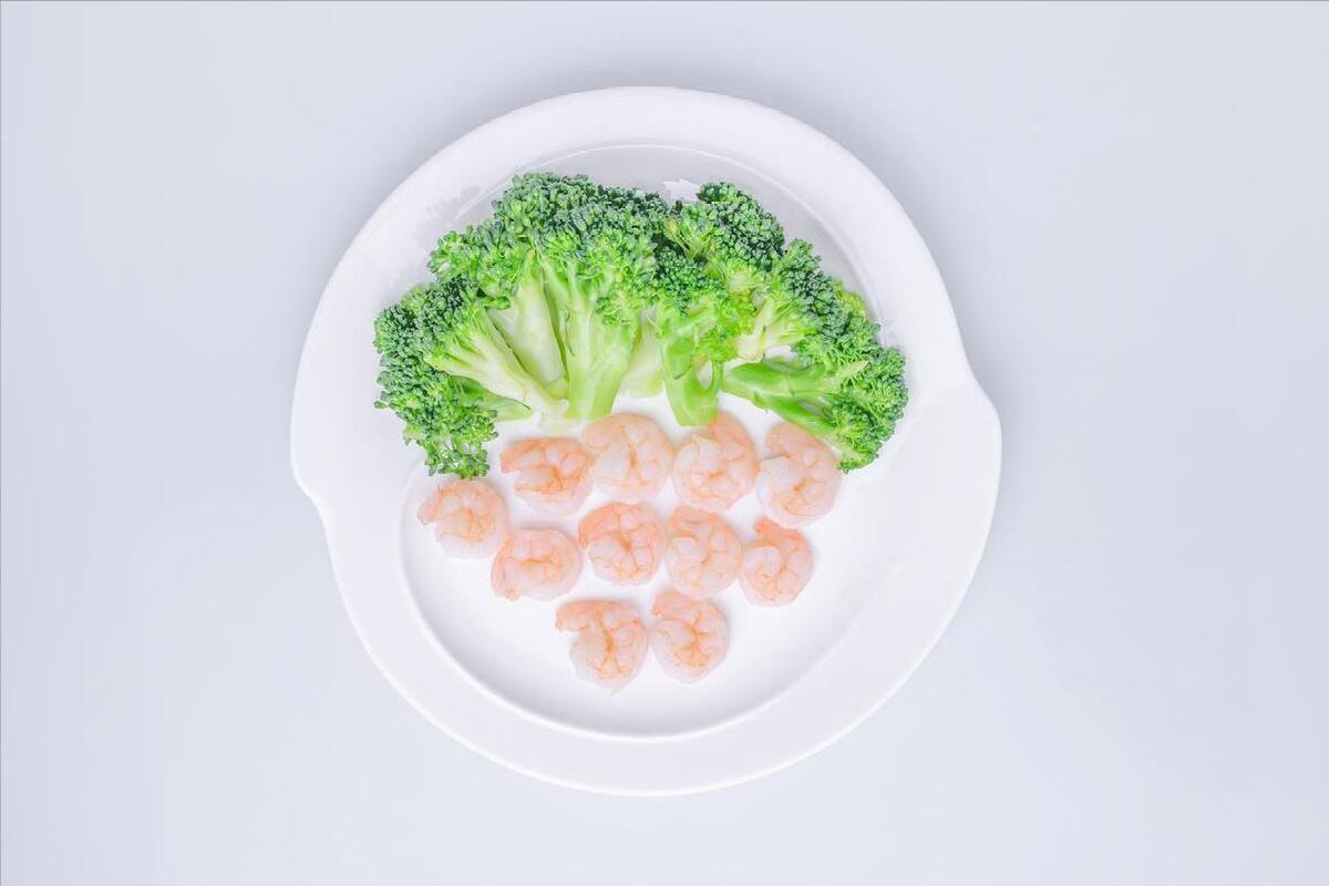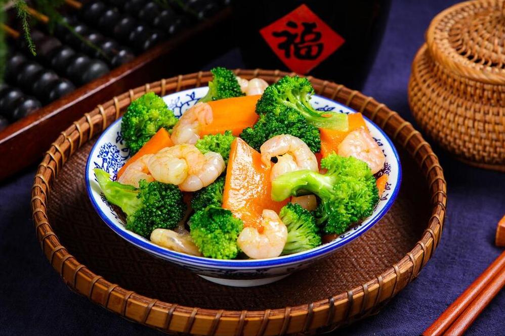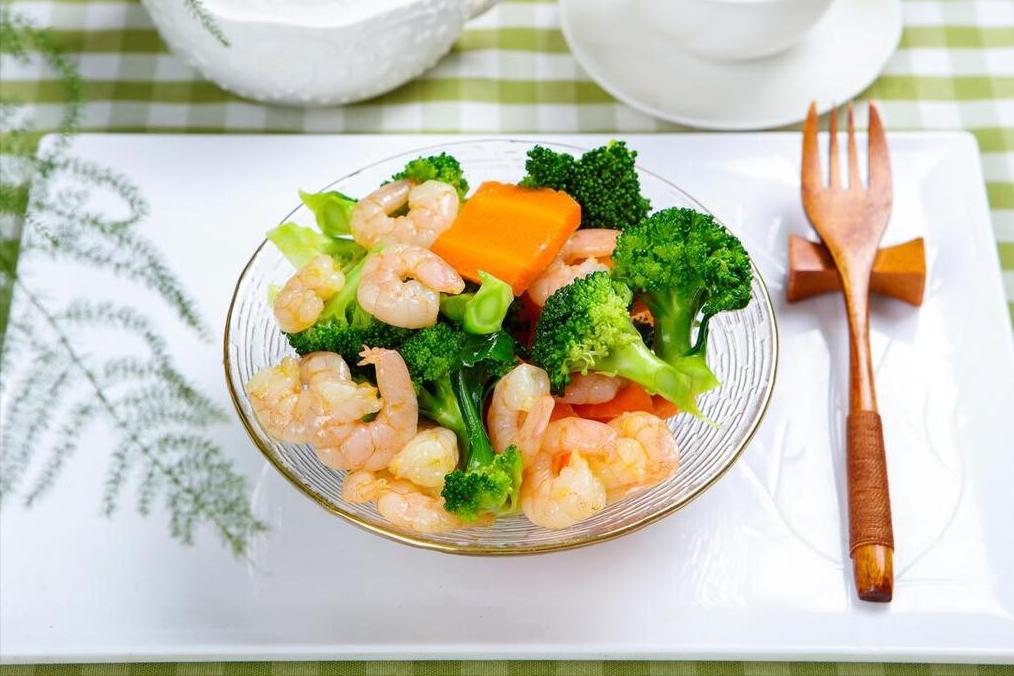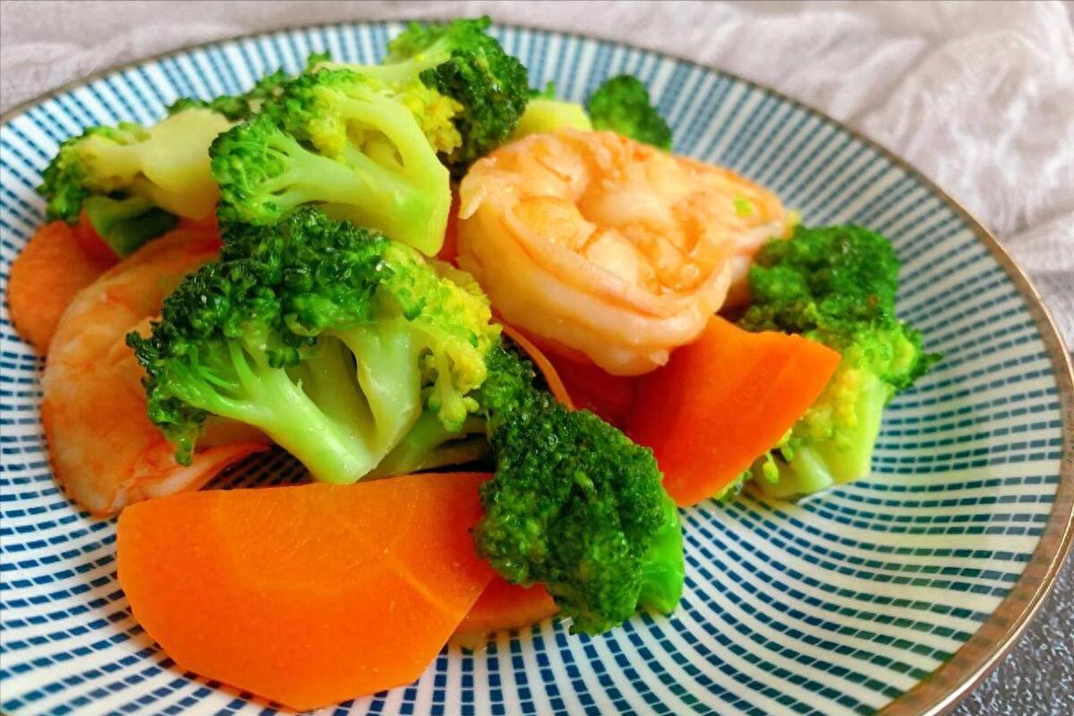 準備:西蘭花、蝦仁、大蒜、胡蘿蔔、料酒、鹽、胡椒粉、生抽、蠔油、植物油