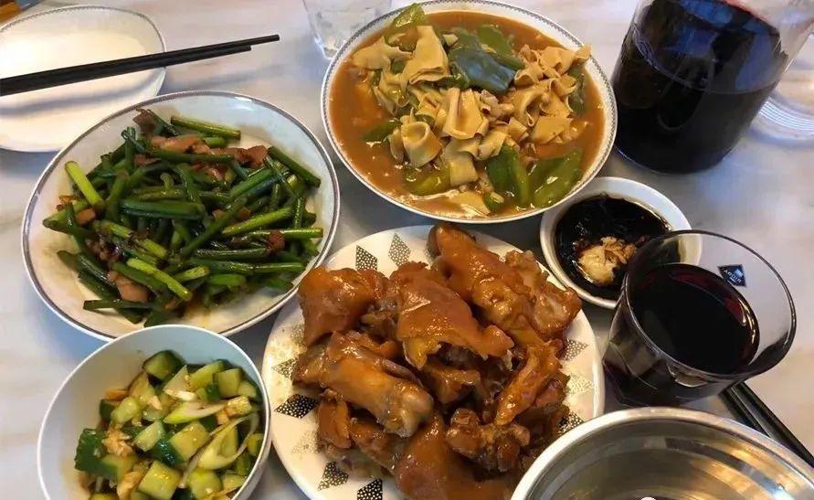 週一的晚餐:一個葷菜滷豬蹄,補充蛋白質和膠原蛋白,一份豆腐皮炒青椒,蛋白質滿滿,維生素C充足,一份應季的蒜薹炒肉絲,鮮脆開胃,一份涼拌黃瓜,清爽美味,和老公一人一杯紅酒,充滿了情調。