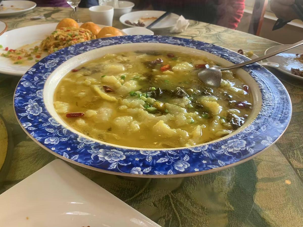 我們這邊的飯店就是實惠,這麼一大份酸菜魚才58元,魚肉片也很多,在外面買一條魚也得30塊錢吧。魚肉片滑嫩鮮美,微辣口,連湯汁最後都喝光了。