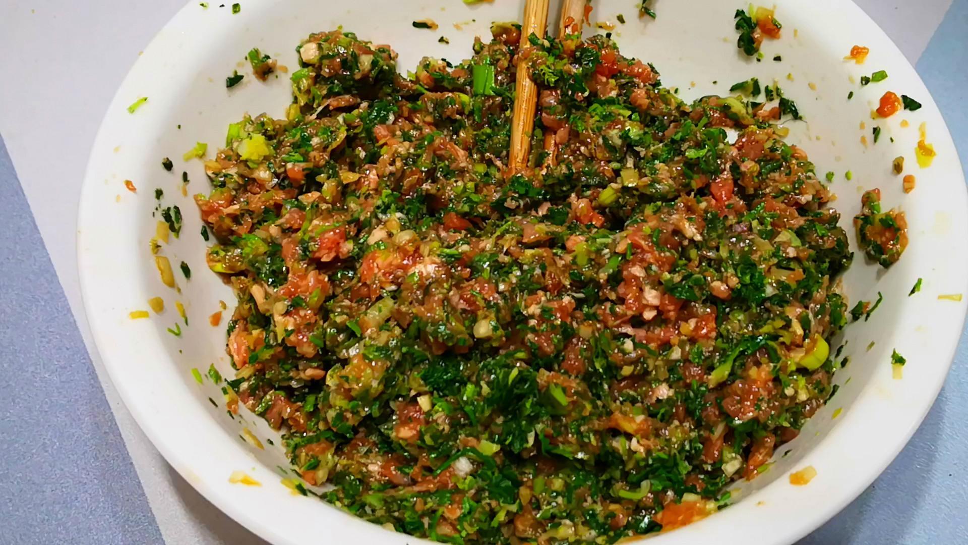 因爲野菜類包餃子都比較喫油,油大一些餃子喫着才香。所以肉餡不要用純瘦肉的,用花肉包出來口感會更香,而且不柴。