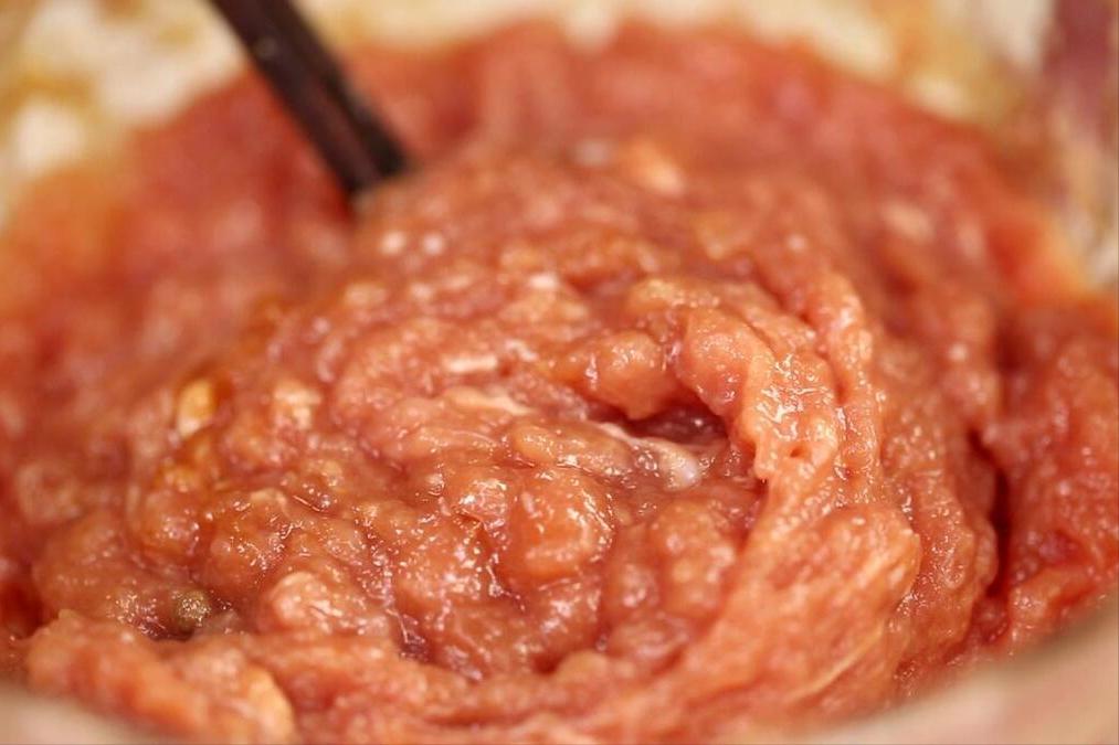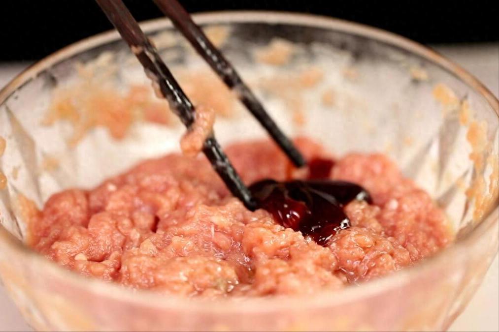 3、稍微攪拌一下,然後再將剛纔泡好的花椒水倒入其中,注意花椒不要倒進去,只把花椒水倒進去就行。倒入其中充分攪拌,直至水分全部混合於肉餡中,肉餡變得上勁即可。“花椒水”,是多放的第1樣,鮮嫩又多汁的關鍵就是它。