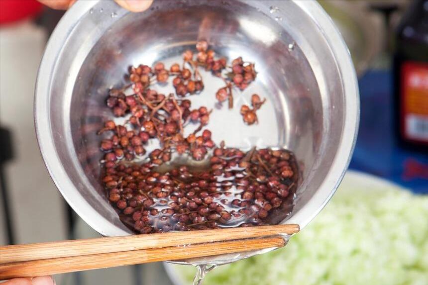 1、乾花椒倒在小碗中,然後來上適量的開水,簡單燙一會兒,等到水不那麼熱了之後,就可以用了。
