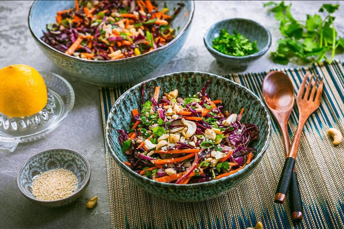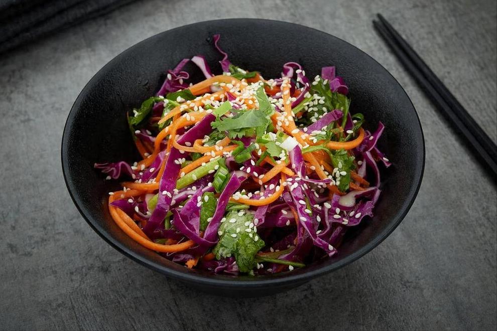 用到:紫甘藍、黃瓜、胡蘿蔔、大蒜、白芝麻、生抽、醋、香油、花椒油、鹽、白糖、味精