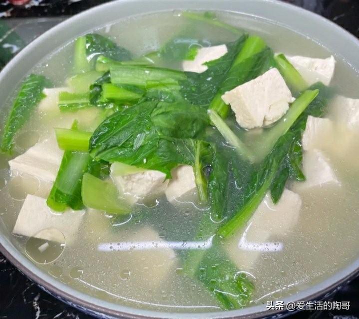 豆腐口感細膩,熱量不高。搭配小白菜一起做湯喝,顏色好看,味道清淡,熱量不高,飽腹感強。