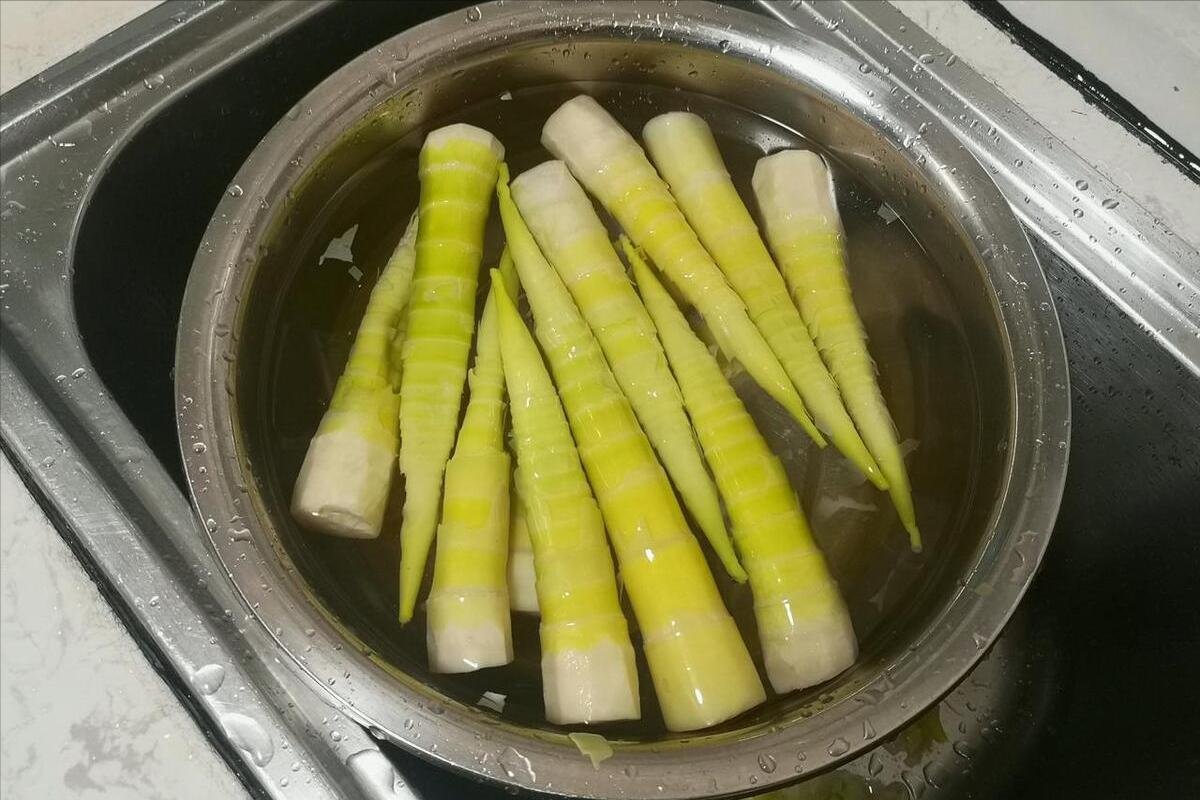 4、焯水後的春筍,咱們將其撈出來,放在涼水中冰一下,接下來將其撈出來,放在通風處晾上一會兒,直至春筍表面沒有水分爲止。如果有水分的話,保存出來會粘到一起,而且上面會有冰層。
