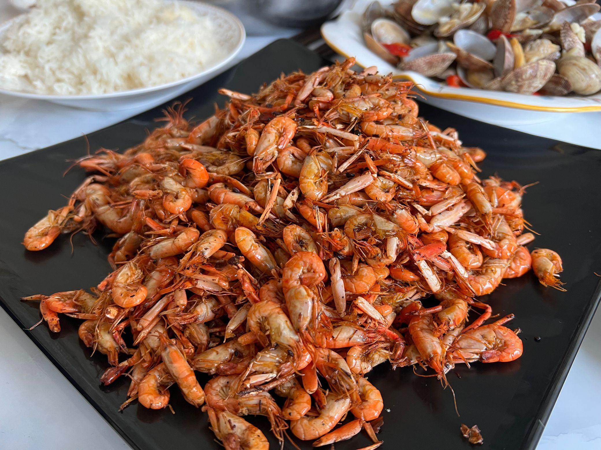 特色海鮮:嘎嘣蝦,10元一斤,老公買了2斤,我不知道怎麼做,大姑姐展示了一下廚藝,小蝦先用冷水清洗乾淨,具體做法:油鍋加熱,放入一塊火鍋底料,爆出香味後,倒入小蝦,大火炒出水份,當把蝦都炒幹後再轉成小火,慢火煎到金黃酥脆,因爲這個小蝦皮多肉少,得把蝦皮煎脆纔好喫。這個菜比較費時間,做了大約半個小時纔出鍋,喫起來香脆麻辣,那叫一個鮮!