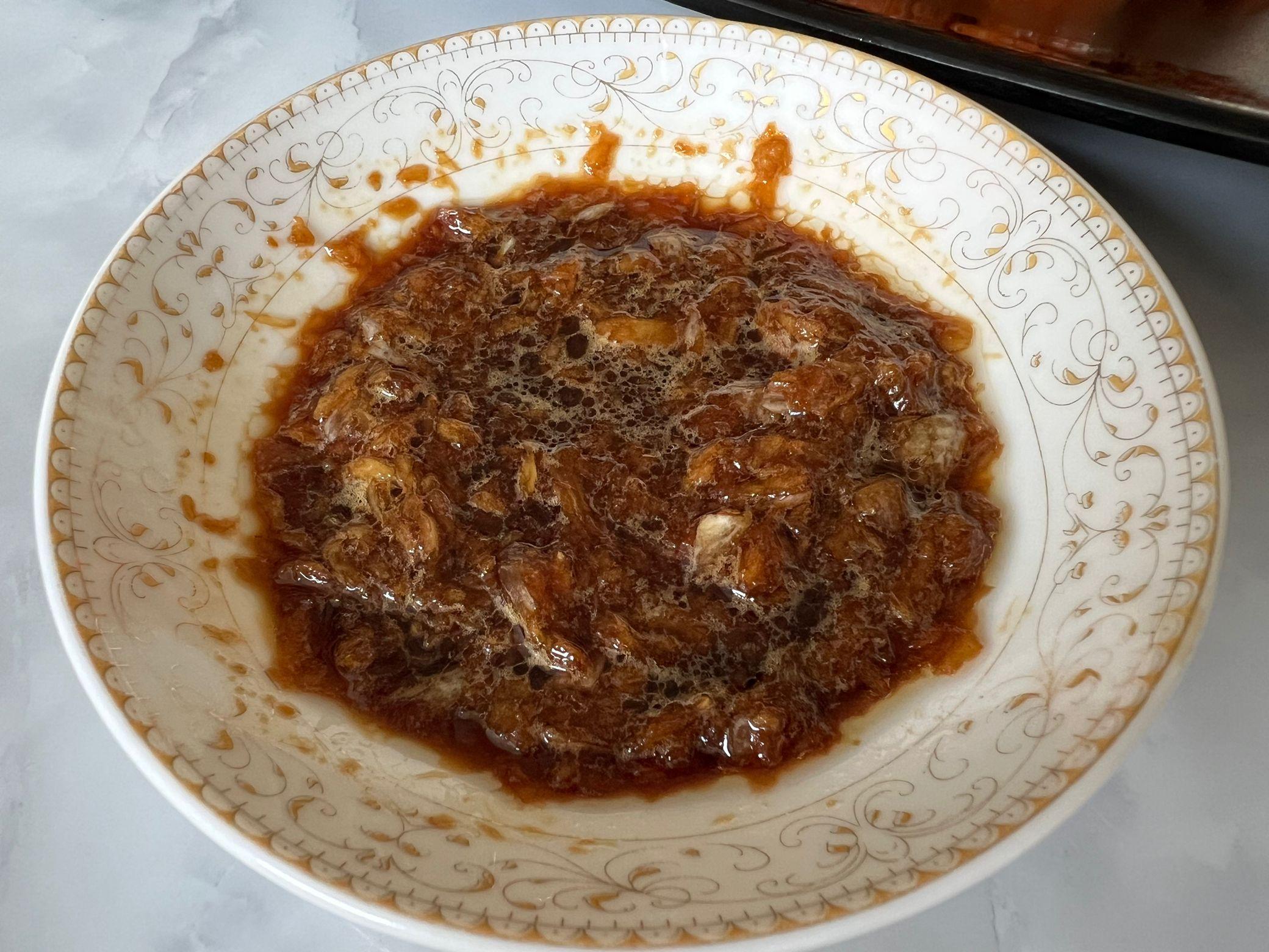 蒜泥是把大蒜搗碎,加入味極鮮、香油,少量味精調味,攪拌均勻就可以了,別小看這一碟蒜泥,我連喫了4塊燉肉都不覺得膩,真是解膩好幫手。