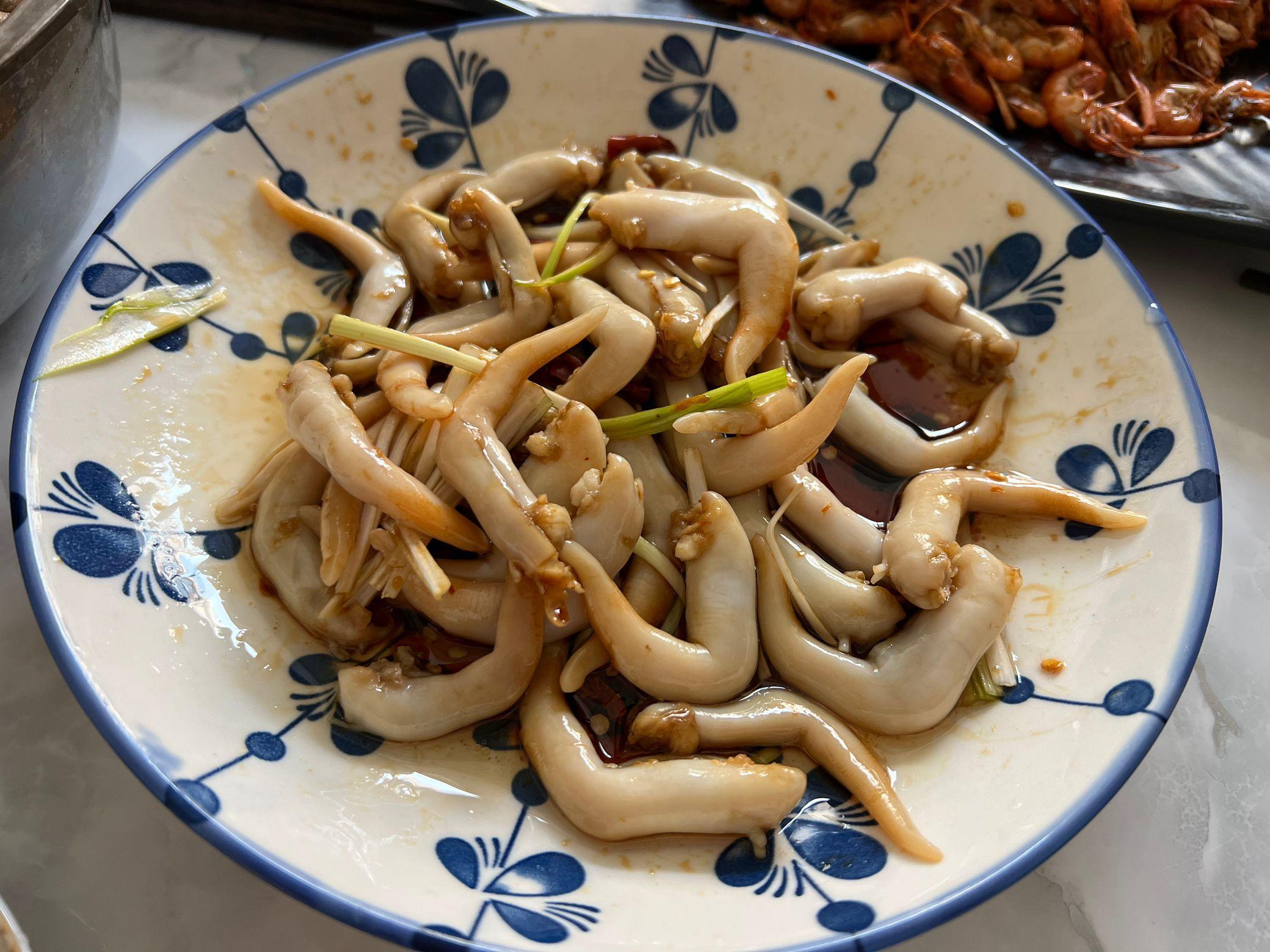 涼拌鳥貝:這是我的拿手菜,鳥貝很貴,一小份就要50元,先把鳥貝用剪刀從中間剪開,去掉肚子裏的黑色東西,清洗乾淨後,鍋裏水燒開,把鳥貝肉放水裏焯水3秒鐘撈出,倒入蒸魚豉油,蒜末,蔥花拌勻裝盤上桌,這個菜的特點是鮮、嫩!