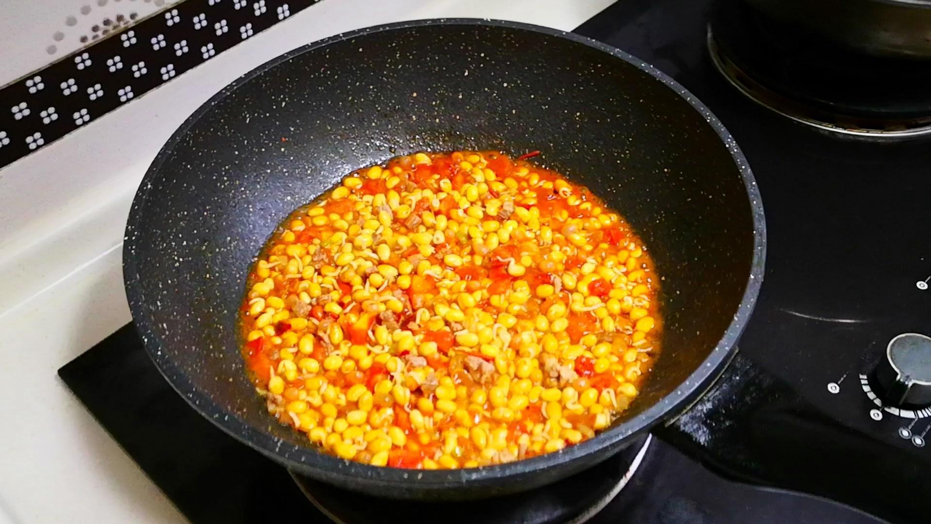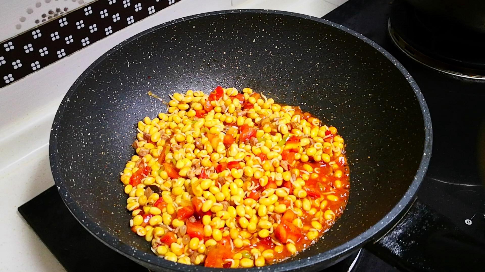 3、起鍋加油,油溫五成熱時放入準備好的肉丁,大火翻炒至肉丁變色後放入蔥花,蔥花炒出香味後加入一勺郫縣豆瓣醬,翻炒至郫縣豆瓣醬出紅油後再倒入西紅柿丁,用鏟子輕輕地按壓西紅柿丁,讓其儘可能多的出汁,完全炒出汁後再倒入黃豆芽,然後少淋入一點清水,蓋上鍋蓋開大火燜一分鐘後打開鍋蓋,加入一勺鹽、一勺白糖調味,翻炒均勻後即可關火出鍋。
