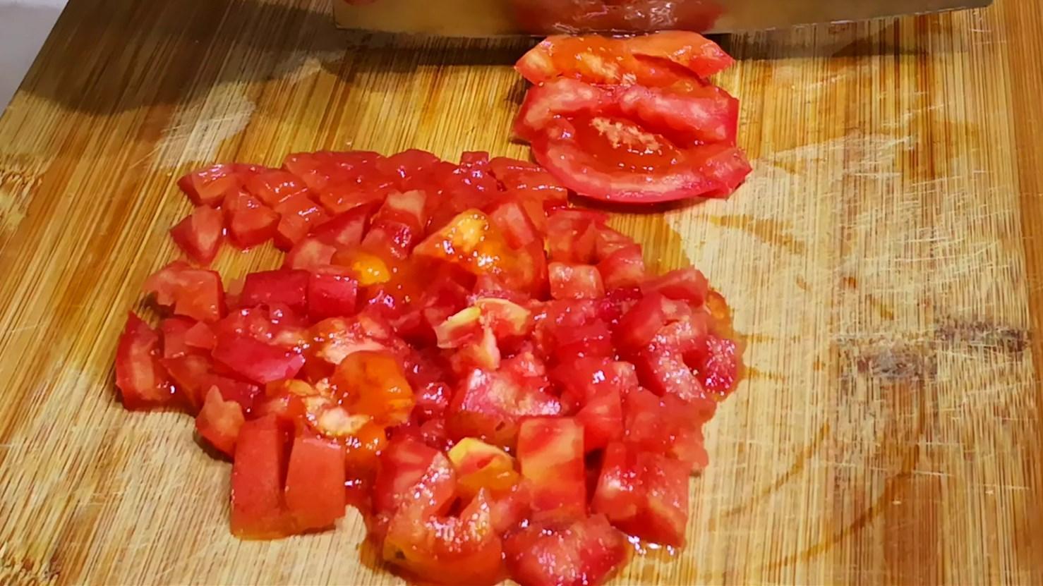 1、一個西紅柿清洗乾淨後不要去皮,很多人做西紅柿喜歡扒掉外皮,這樣西紅柿的營養會流失,如果確定所買的西紅柿是沒有農藥殘留,那就不需要去外皮,先切片再切成小丁;一顆小蔥切成蔥花;一塊五花肉切成豬肉丁備用。