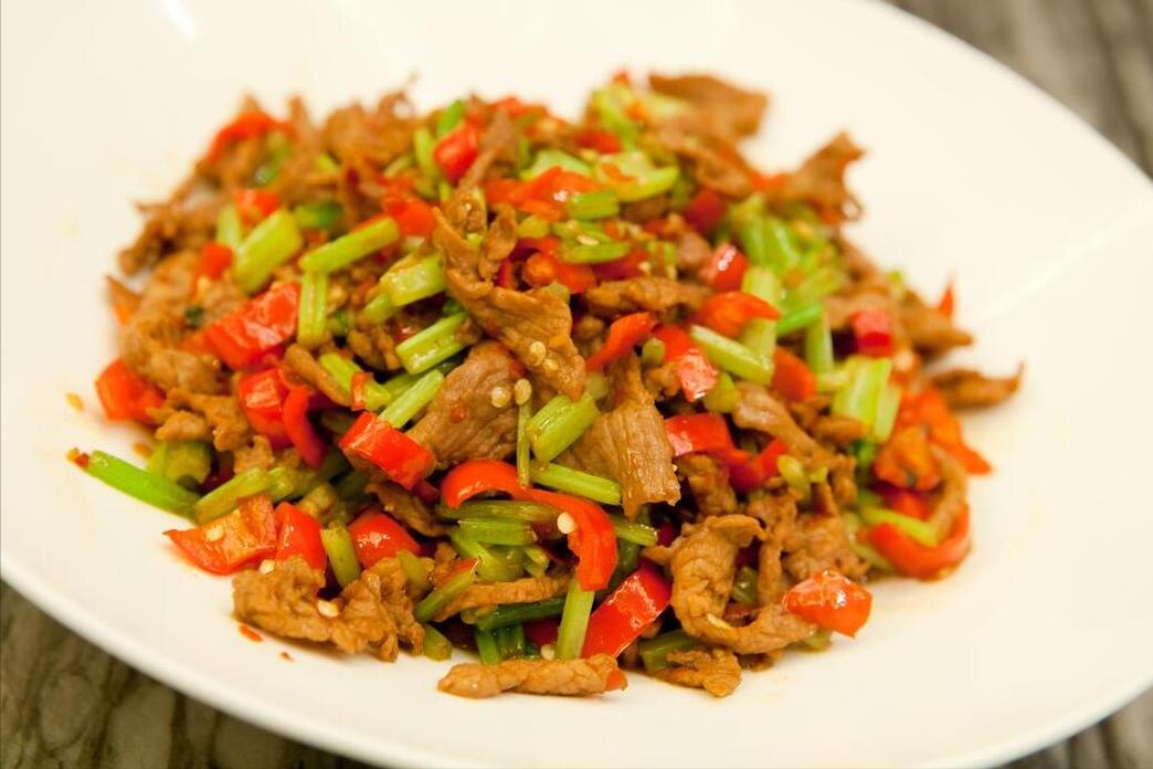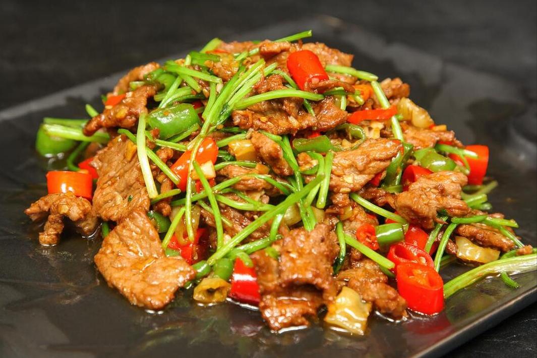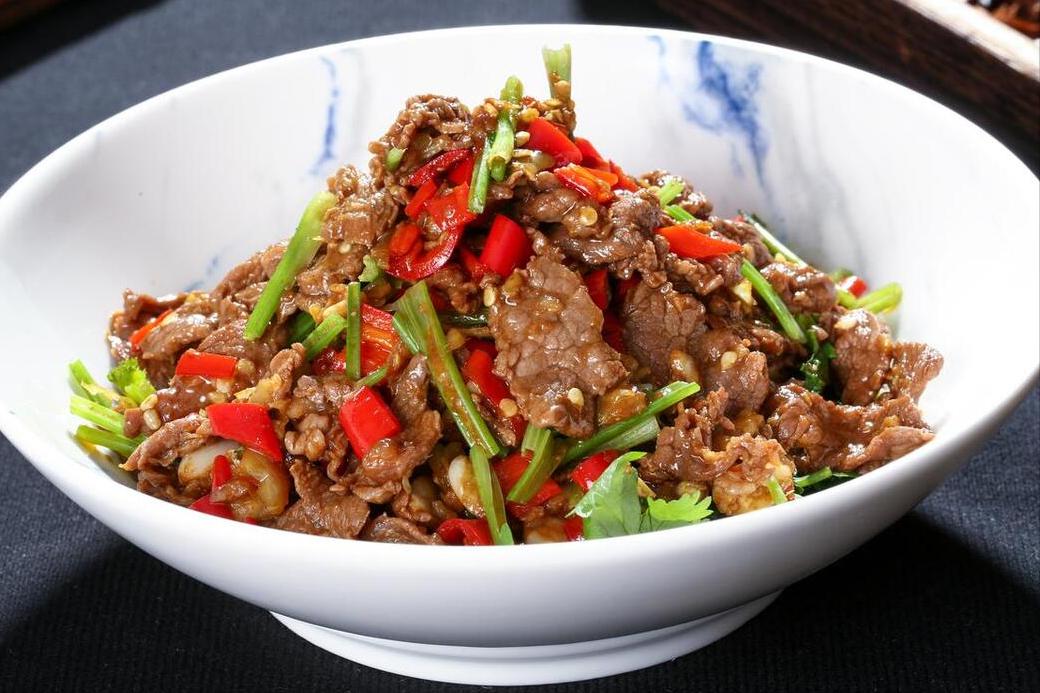 食材:牛肉、香菜、大蒜、生薑、青紅辣椒、小米椒、鹽、雞精、白胡椒粉、生抽、蠔油、蛋清、澱粉、食用油