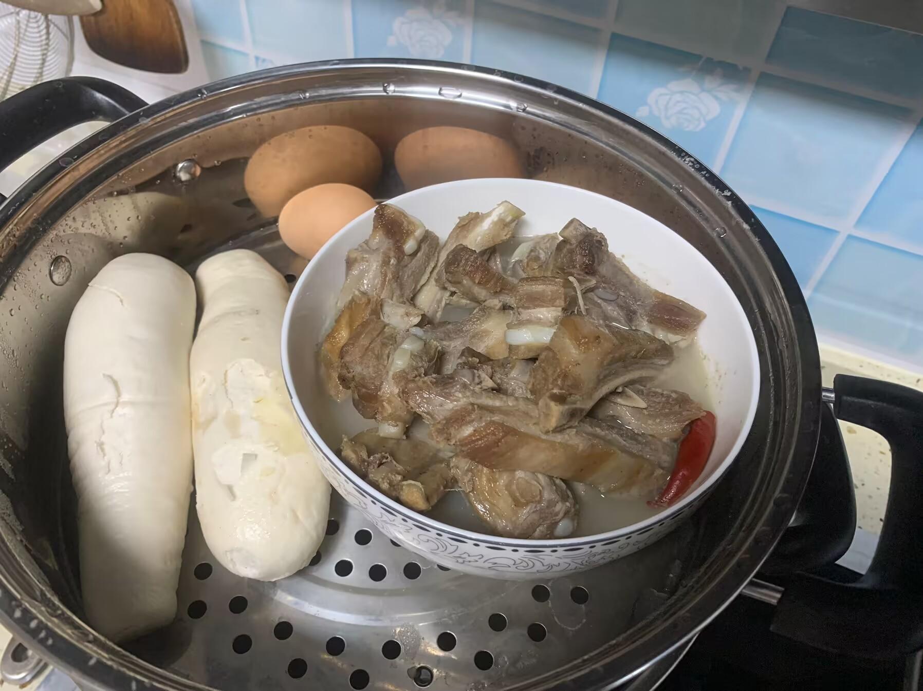 做早餐最快捷的方法就是煮米飯的時候把需要蒸的食物放在上面,這樣粥熟了,像雞蛋、饅頭還有剩菜都能蒸熟。大米用清水淘洗幾遍,冷水下鍋後大火煮,用勺子攪動一下,把洗乾淨的雞蛋、饅頭和排骨放在蒸屜上面,用中小火煮20分鐘就可以。
