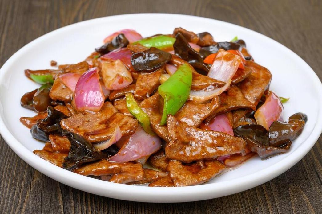 食材:豬肝、洋蔥、辣椒、蔥薑蒜、鹽、白糖、雞精、白胡椒粉、生抽、老抽、蠔油、料酒、白醋、澱粉、食用油