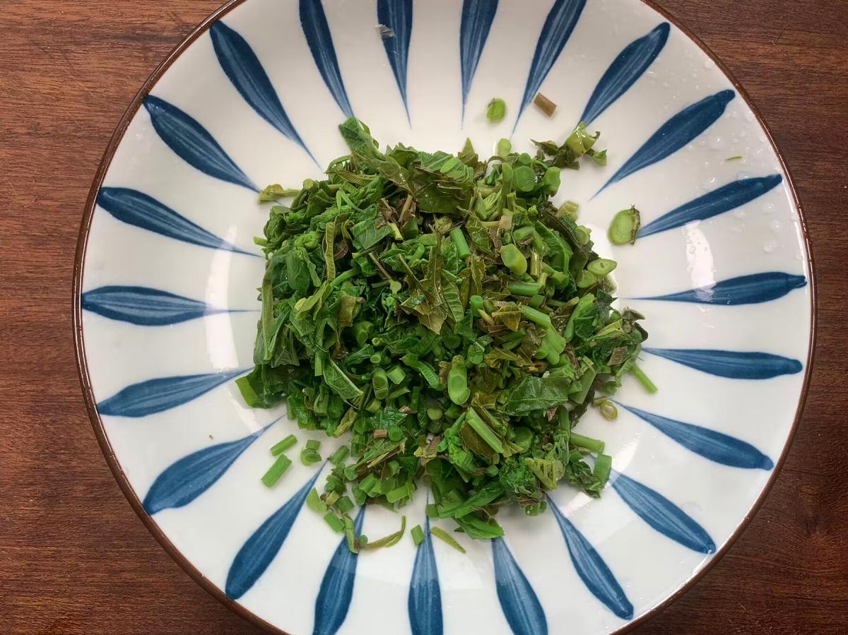 2、煮好的香椿過一遍涼水,攥幹裏面的水分,用刀把頭部一小部分切掉,然後再改刀切成大概釐米左右的長段,不要切的太長,切好後放入盤子內就可以。