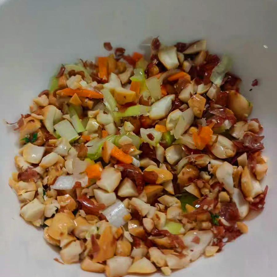 2.涼拌麥蒿時加入適量花生米,可以使拌好的麥蒿喫起來更香、口感更豐富,所以我們準備半碗花生米,將其碾成花生碎,放入碗中備用;接着再準備點配菜:半根胡蘿蔔切成胡蘿蔔丁備用;再準備一適量的小蔥花備用。