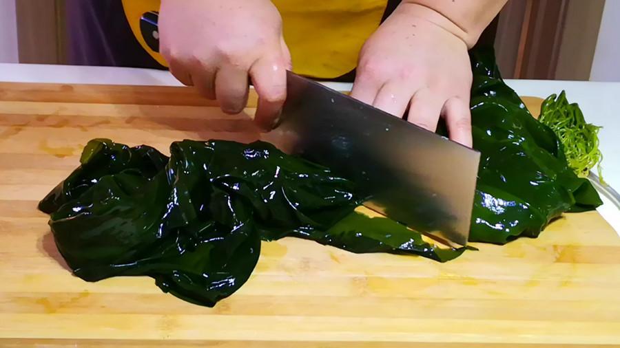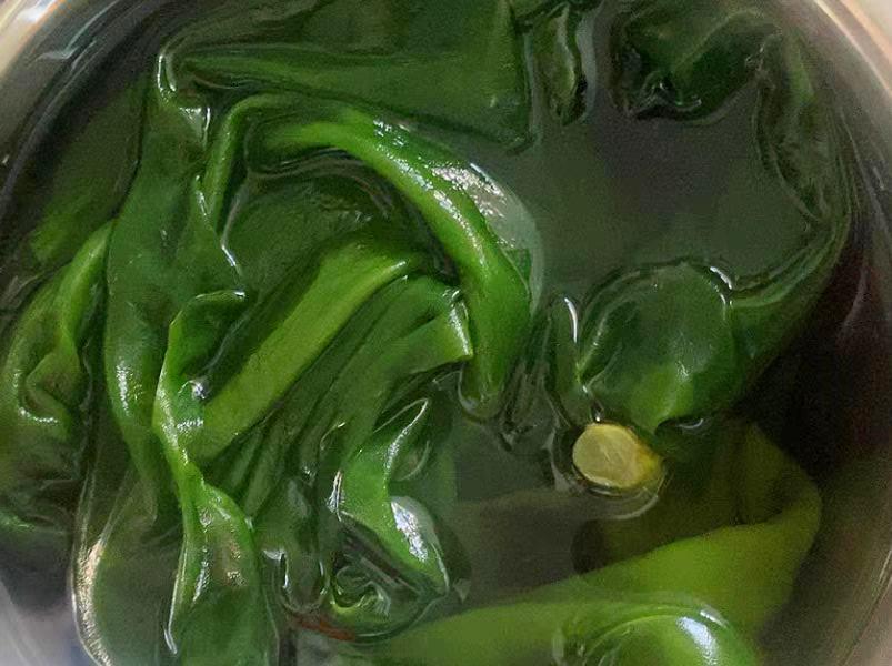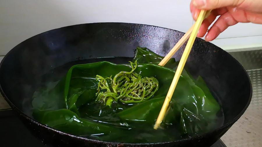 清洗乾淨後的海帶再放到開水鍋中焯燙片刻,海帶焯水可以減輕海帶的腥味,以及去掉海帶表面的粘液,焯燙不宜太久,1~2分鐘即可,接着撈出海帶過涼水。控乾淨水分後再把它剁細備用。