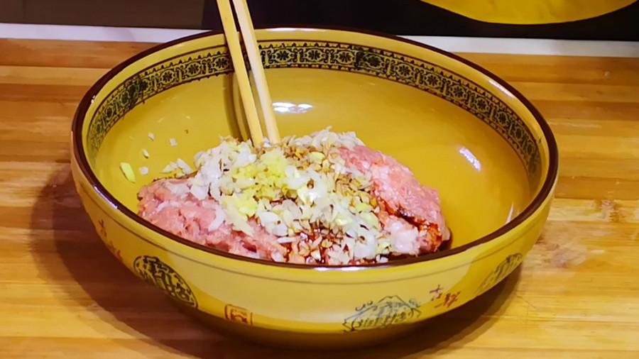 再取一塊三分肥七分瘦的花肉剁成肉餡,剁好的肉餡放入大碗中,加入蔥花和薑末,然後將浸泡好的花椒水過濾一下,分少量多次加入到肉餡中,邊加邊順着一個方向用力攪拌,使肉餡上勁。