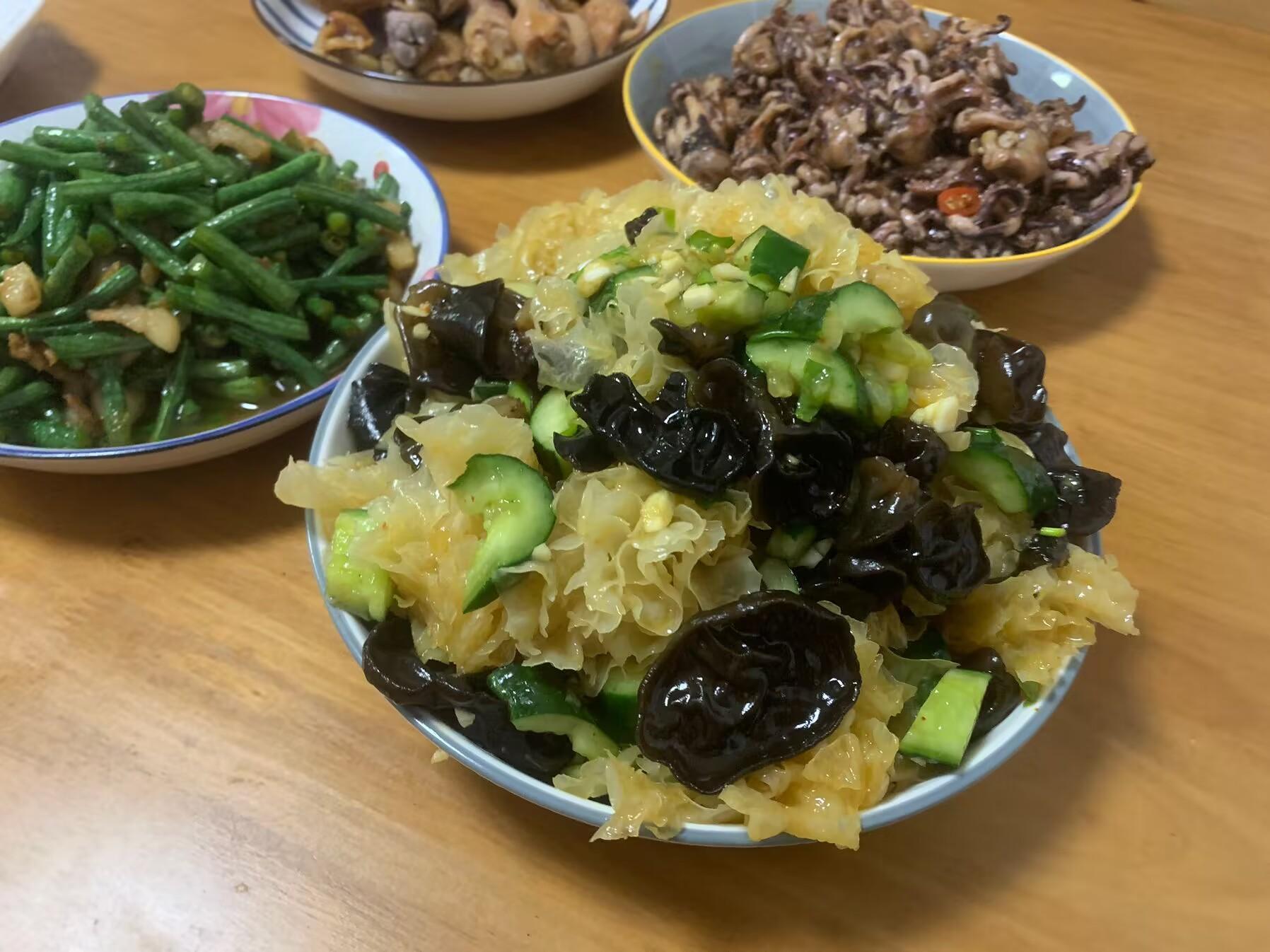 弟妹廚藝就是好,我們姐妹幾個人每次必點的就是涼拌菜,比外面賣的涼菜好喫多了。每次我都學着做,放同樣的調味品都調不出這樣的味道來。弟妹拌的黃瓜木耳酸甜可口,清脆爽口,超好喫,一大盤上桌秒光。