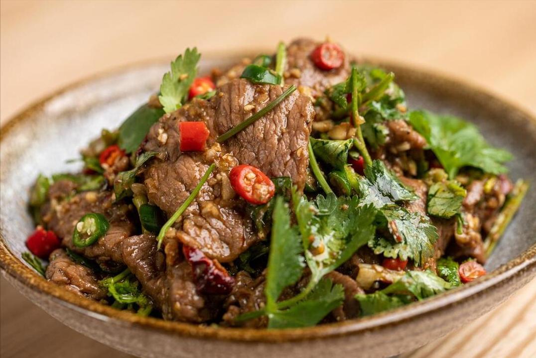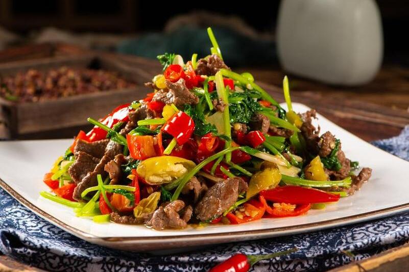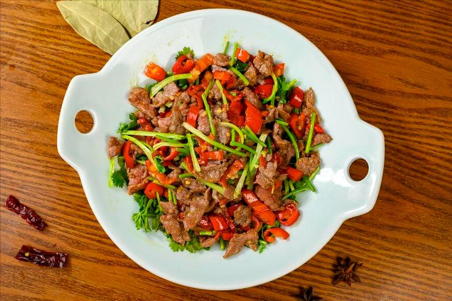 食材:香菜、牛肉、蔥薑蒜、小米椒、鹽、雞精、蛋清、澱粉、生抽、蠔油、老抽、料酒、食用油