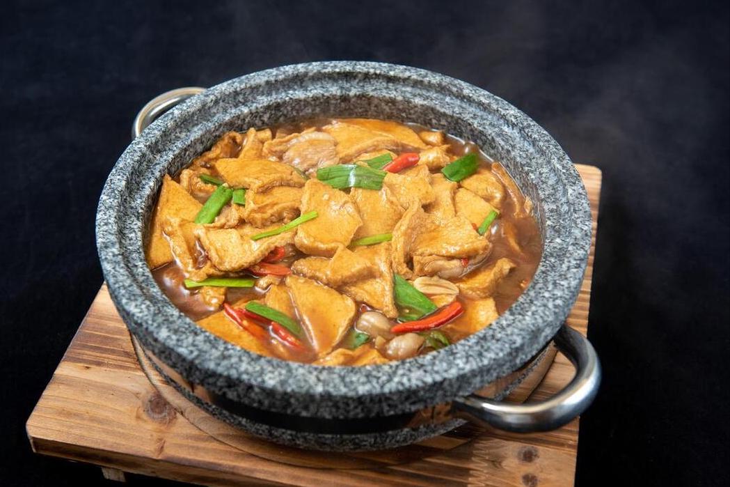 2、蠔油2勺、生抽1勺、少許白糖、胡椒粉,再來5勺清水調製均勻。重新起鍋,把蔥蒜、小米椒下進去,炒出香味以後,把豆腐重新下進去,把料汁也倒進去,蓋上蓋子煮上8分鐘左右,湯汁收的差不多以後,出鍋。