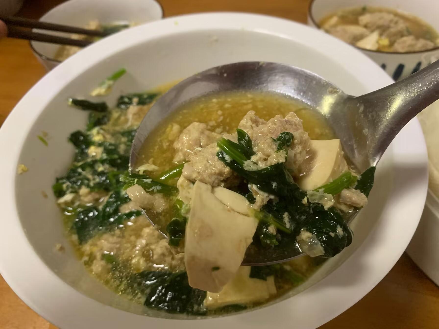 新鮮的豬肉先醃五分鐘,讓它入味更好喫。醃豬肉餡的時候放入蔥薑末,打上一個母雞蛋增加肉的滑嫩口感,喫起來不柴,再放入少許鹽、適量料酒去腥、少許醬油上色、2勺味極鮮、蠔油和適量香油攪拌調味。鍋中放入適量的清水大鍋煮開後,用小勺取肉餡團一下,圓不圓沒有關係,只要大小差不多就可以,丟入煮鍋內,轉成中火煮,豬肉丸子煮熟後,婆婆把中午剩下的菠菜雞蛋湯倒進去了,還放了1塊錢的嫩豆腐,豆腐煮熟後滴幾滴香油攪均勻,關火後豬肉丸子