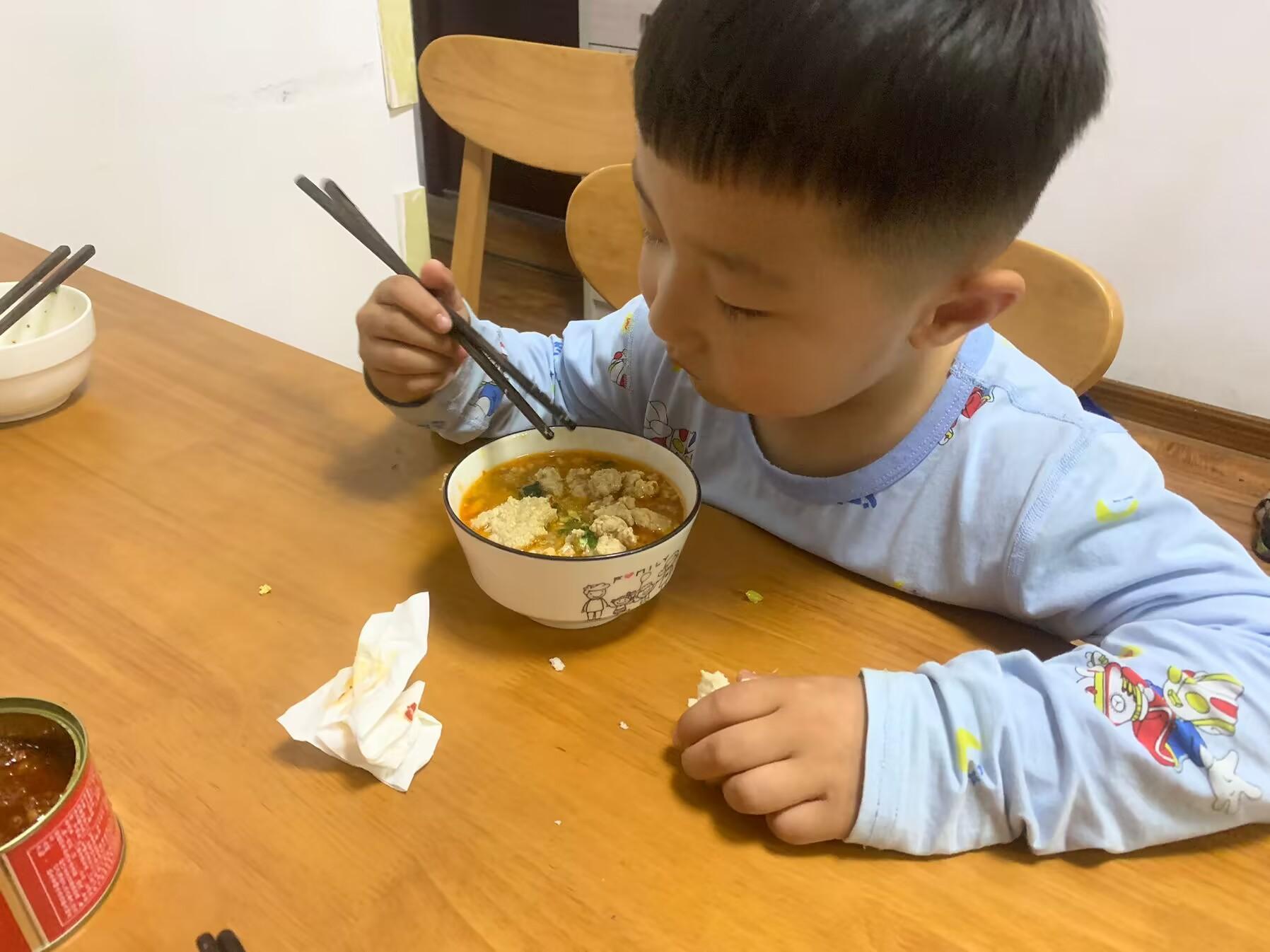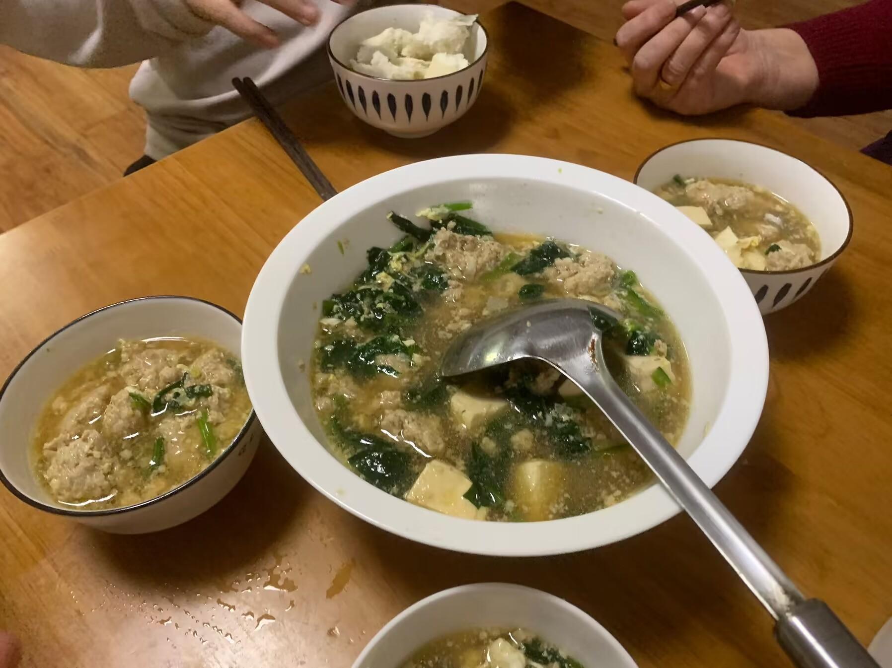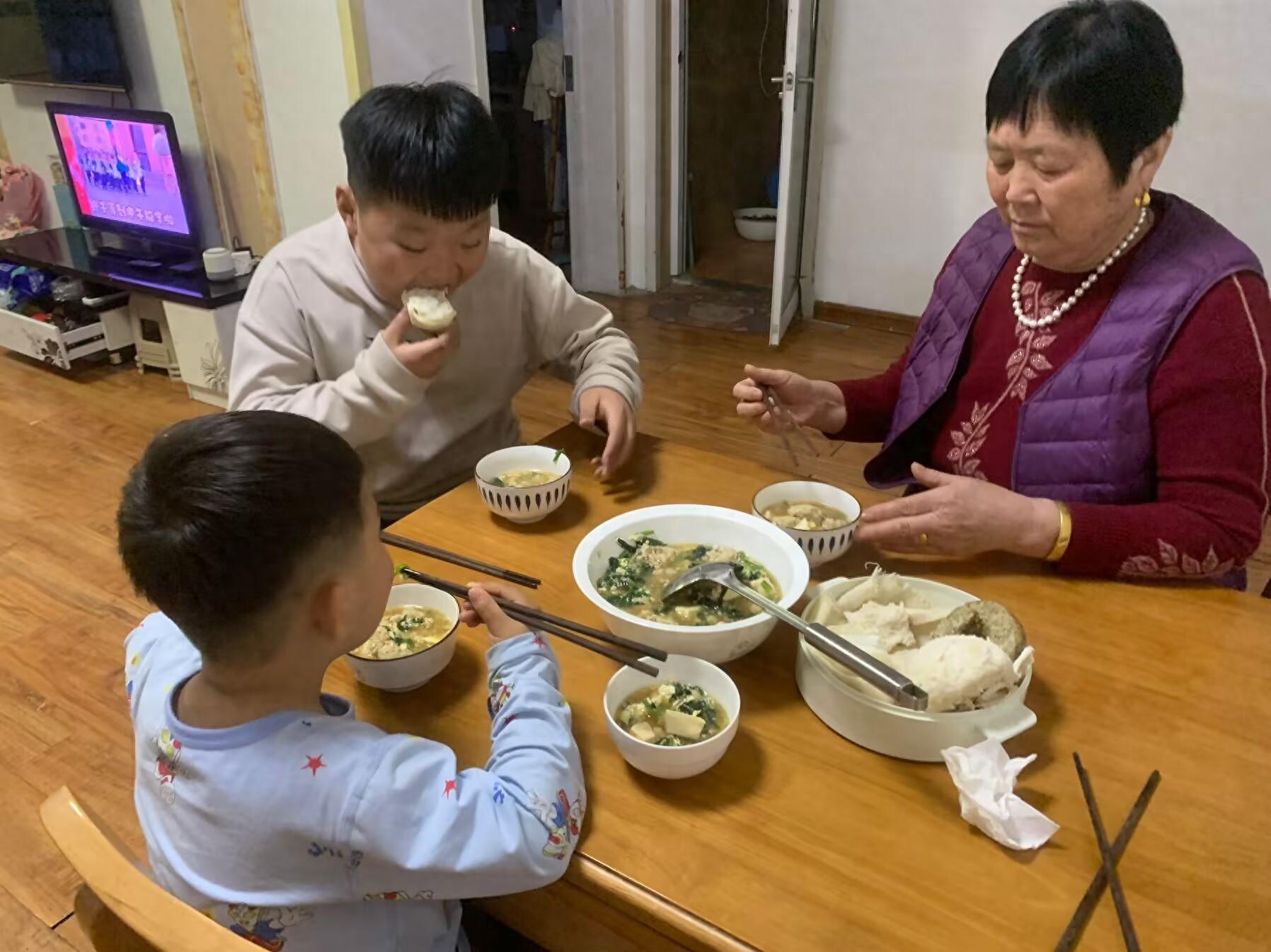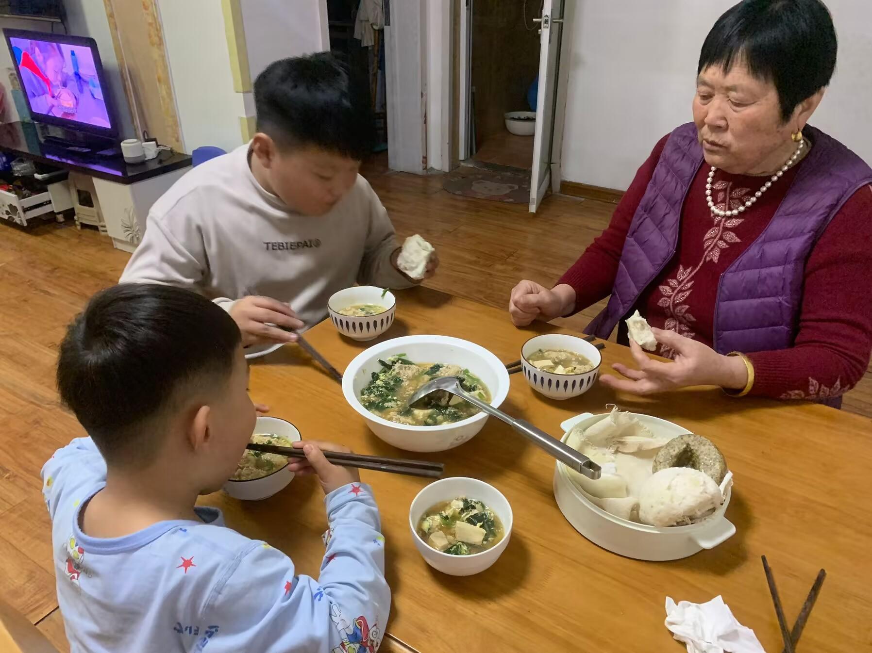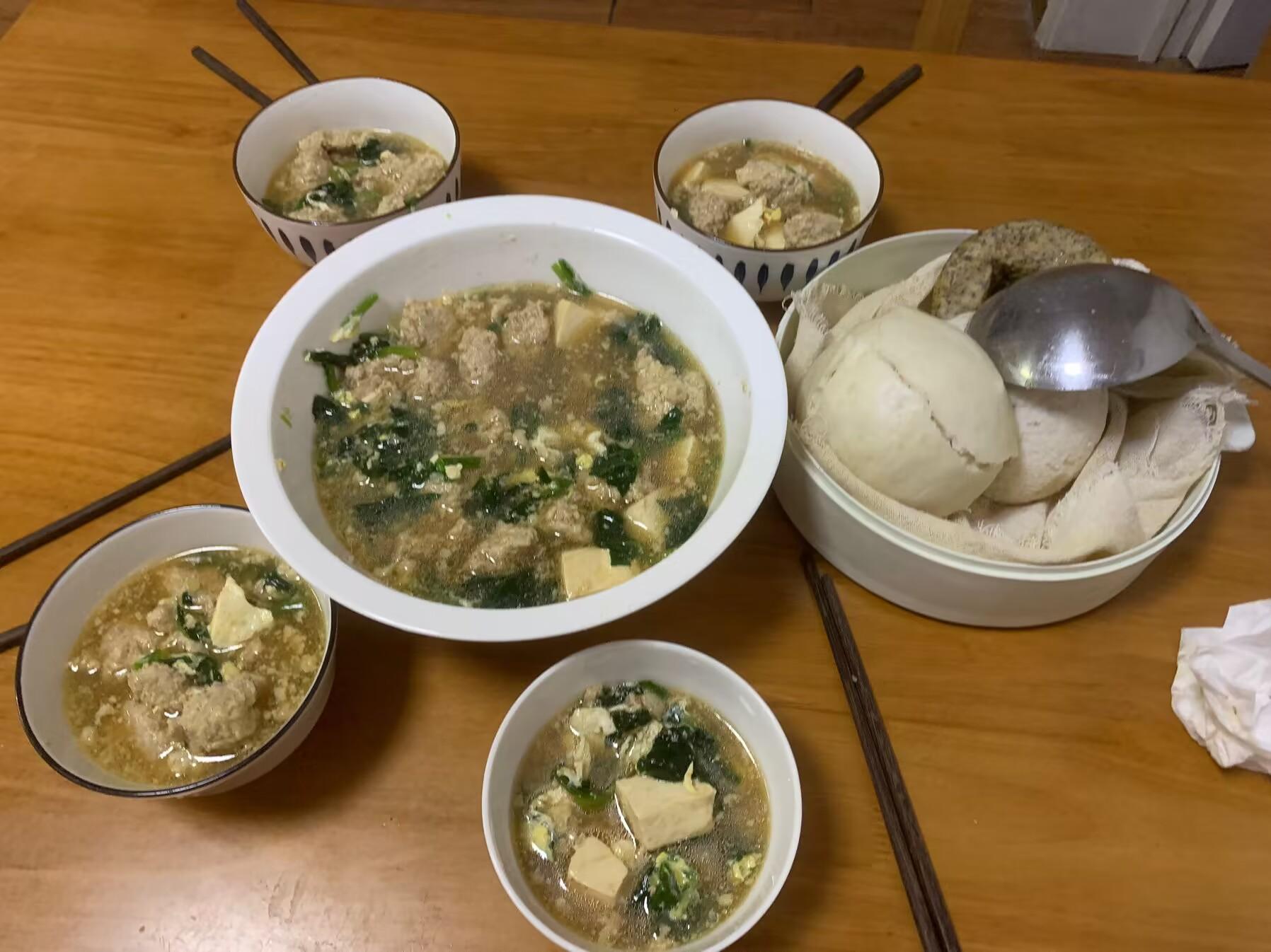 豬肉丸子湯倒入了一個大一點的容器內端上餐桌,孩子們一人一個小碗就坐那裏等着了,奶奶給每人盛了一碗,喫着自己蒸的大饅頭,孩子們一直喫也不抬頭。兩個半大小子特能喫,也喜歡喫肉,婆婆把自己碗裏的丸子幾乎都給兩個大孫子了,自己只喝了點湯,喫了半個乾糧。