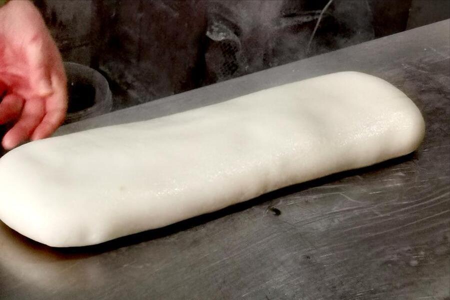 4、很多朋友說,現在溫度還特別燙,拿出來馬上就要揉嗎,沒錯的,不然涼了以後會很硬,就很難成型了。直至從之前的粉狀,變成表面光滑的麪糰後,就可以了,再將其揉成長條狀。