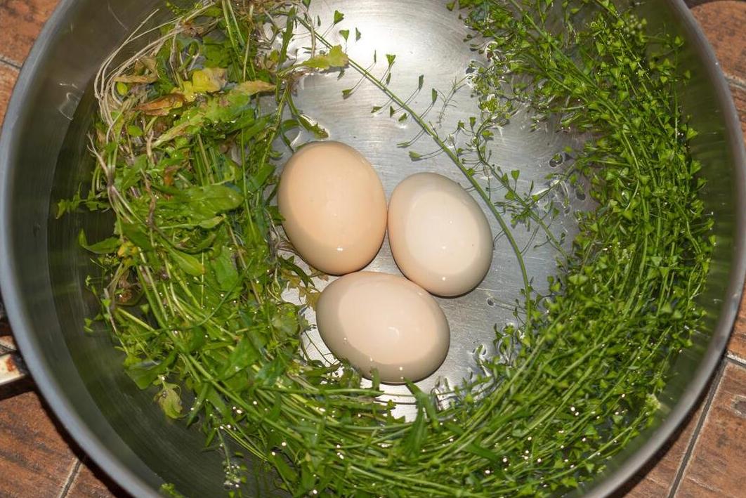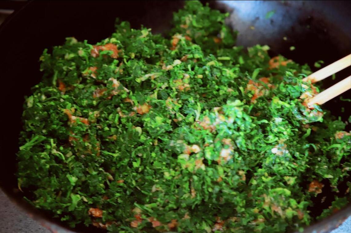 2、焯水後撈出來,攥幹水分後切碎,盛在一個小盆裏,之後往其中打上3個雞蛋,再來2勺麪粉,切點蔥花倒進去,還有適量的鹽、雞精也都加進去以後,將其充分攪拌均勻,調製成麪糊狀。