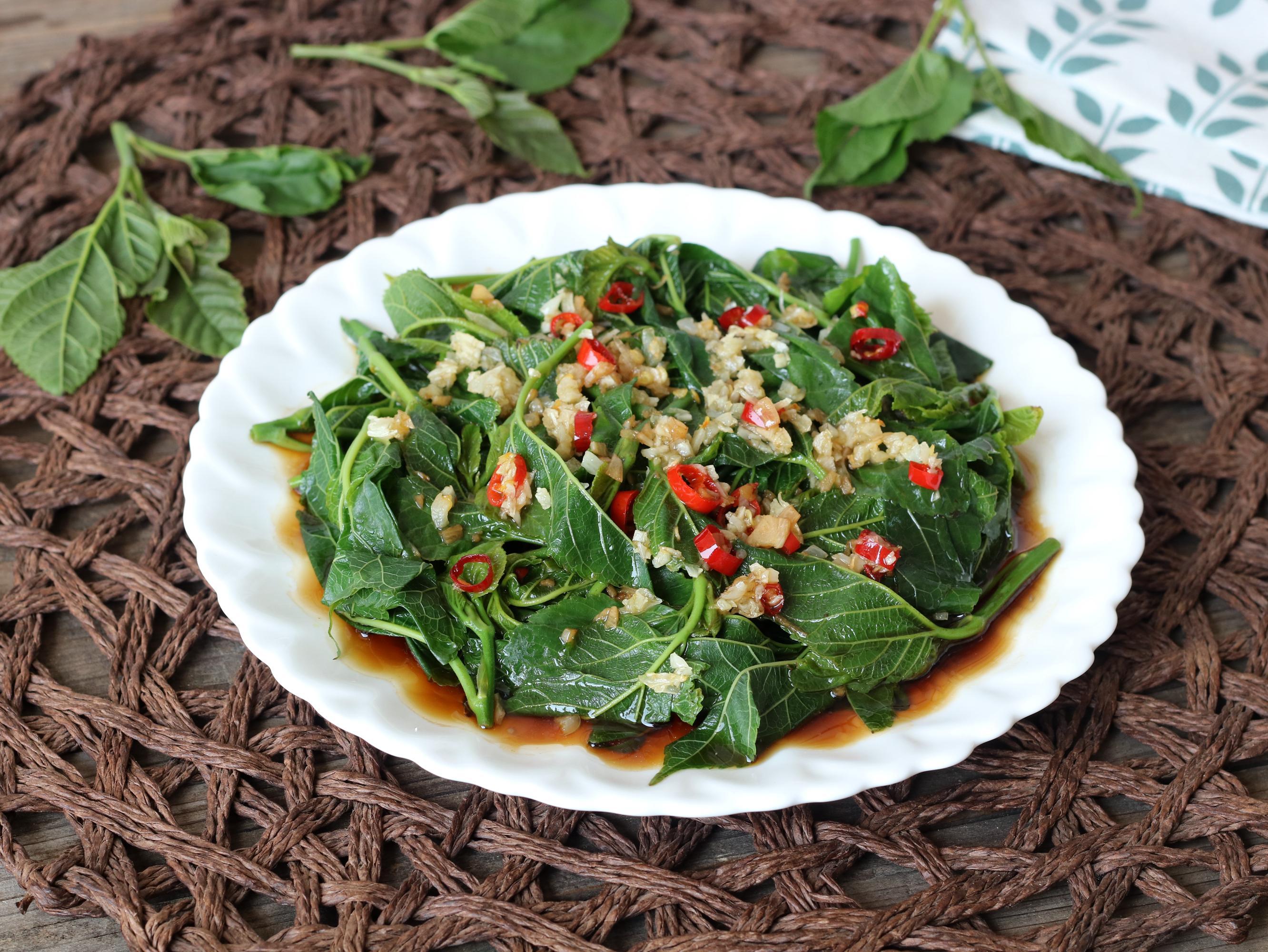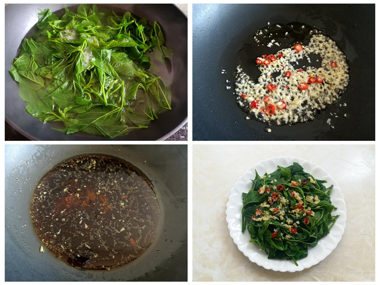 食材:桑葉 適量,大蒜 5瓣,辣椒 1個,食用油、生抽、蠔油