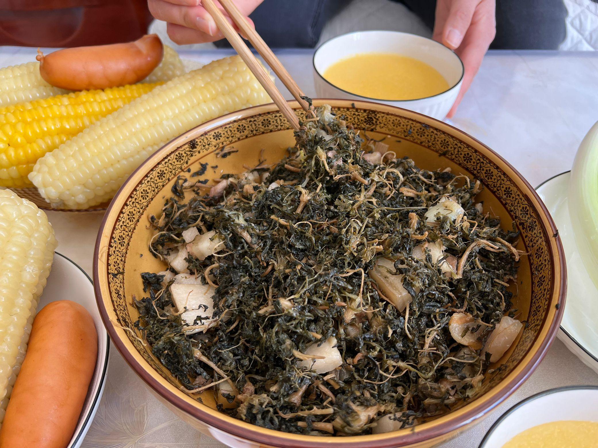 早餐我做了薺菜蒸五花肉,和梅菜扣肉不分上下,老好喫了,這一大碗把兩個兒子喫嗨了。薺菜乾提前一晚上浸泡,泡軟後擠幹水分切碎,放入大碗中,五花肉切小塊放在薺菜上面,(因爲乾菜比較吸油,加五花肉最合適了,油水滲透到薺菜中,香兒不膩)再加適量食用油和鹽,放鍋裏蒸熟即可,以前以爲只有南方纔有梅乾菜,其實北方曬的乾菜是一樣的。