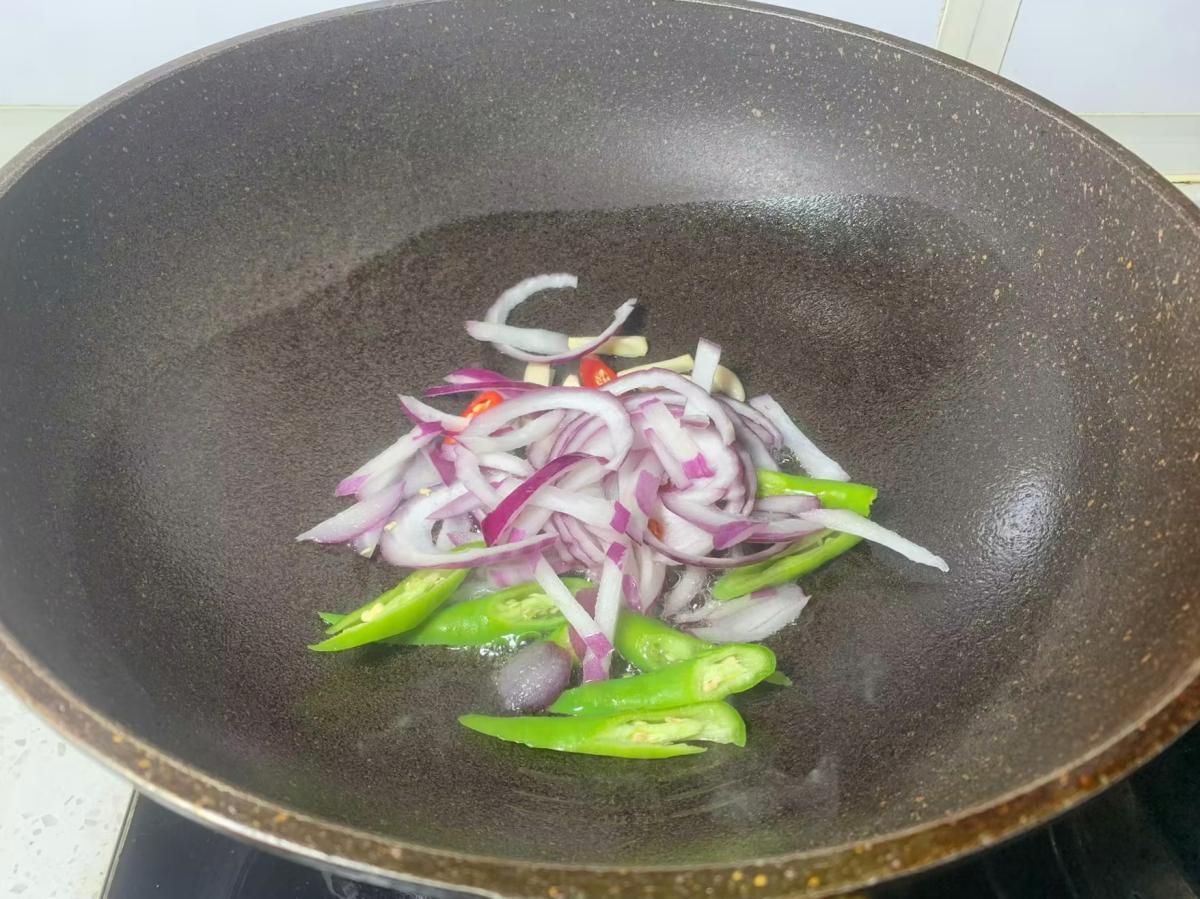 3、無水的炒鍋內倒入少許食用油,油溫升高後把蒜粒、杭椒段、小米辣段和洋蔥段都放進去,開中火用鏟子不停的翻炒,炒出香辣味。
