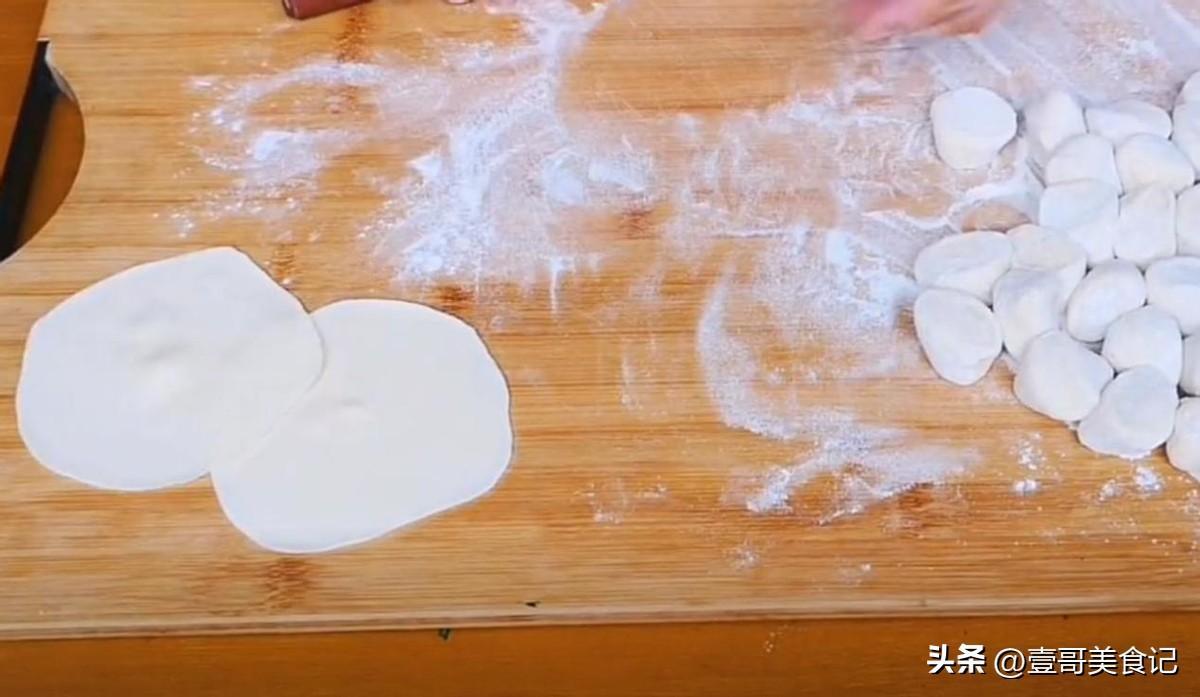 第六步,現在我們要準備包子皮了,先準備幾張餃子皮,四五張摞在一起,然後用擀麪杖將它們在不同的方向擀開,把它們擀成又薄又大的皮兒。就用這個方法,把所有的餃子皮都擀成大大的包子皮兒。如果可以自己擀包子皮,那就更好了!