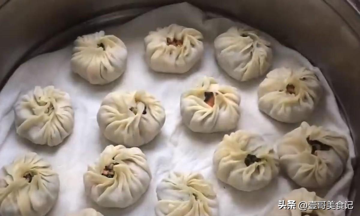 第七步,取出一張包子皮,把餡料舀在皮中間,然後邊打折邊封口,一個包子就包好了,就按這個方法把所有的包子皮都包上,餡料放進籠屜中。