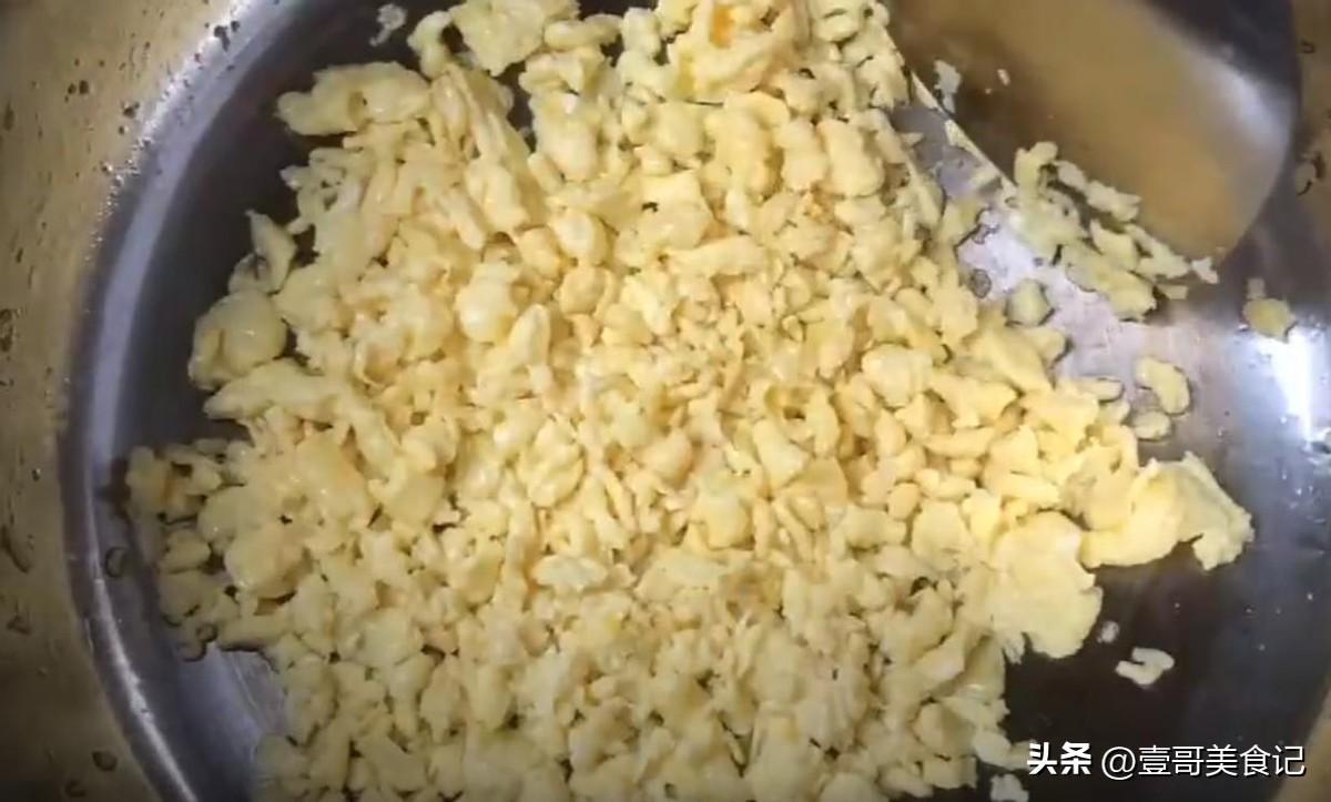 第三步,準備四個雞蛋,全部打進碗裏,再少量的加入一點兒食用鹽,用筷子把它們攪拌均勻,然後我們起鍋燒油,等油熱了,把雞蛋液全部倒入鍋中,用鏟子快速的翻炒,要把雞蛋全部炒好,待用。