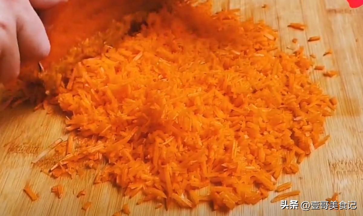 第四步,準備一根胡蘿蔔,先把它們擦洗乾淨之後再擦成絲,接着用菜刀把它們切成胡蘿蔔碎丁。最後我們還要再準備一點蔥花。現在把炒好的雞蛋,胡蘿蔔碎丁全部放進紅薯葉子裏面,然後再把切好的蔥花放在上面,將熱油淋在蔥花上面,嗆出香味來。