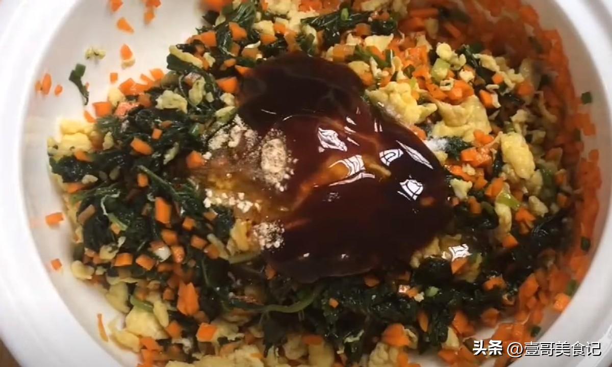 第五步,我們要開始弄調料了,先給餡料上面加入蠔油,胡椒粉,食鹽和香油,然後就用筷子把它們全部攪拌均勻,餡料就準備好了。