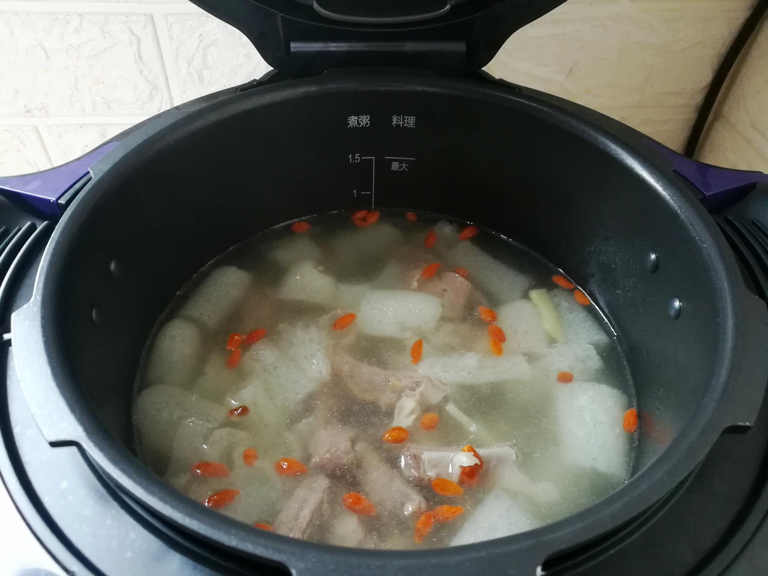 4,煲湯完成,加入切成段的竹蓀和枸杞煮5分鐘,加入適量的鹽調味,出鍋盛到碗裏,撒上香蔥。