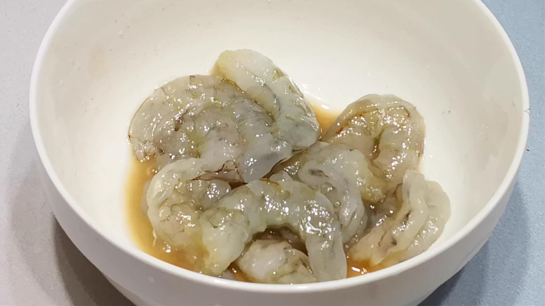 1、處理蝦仁:買回來的大蝦去掉蝦頭和蝦皮,然後開一下蝦背,再取出蝦線扔掉不要,然後進行醃製,加入一勺鹽、適量的胡椒粉和料酒抓拌均勻後,再加入一個蛋清和適量的澱粉,充分攪拌均勻醃製15分鐘。這一步給蝦仁上漿很重要,既可以給蝦仁去腥和入味,同時又能鎖住蝦仁內的水分,使蝦肉保持鮮嫩飽滿。