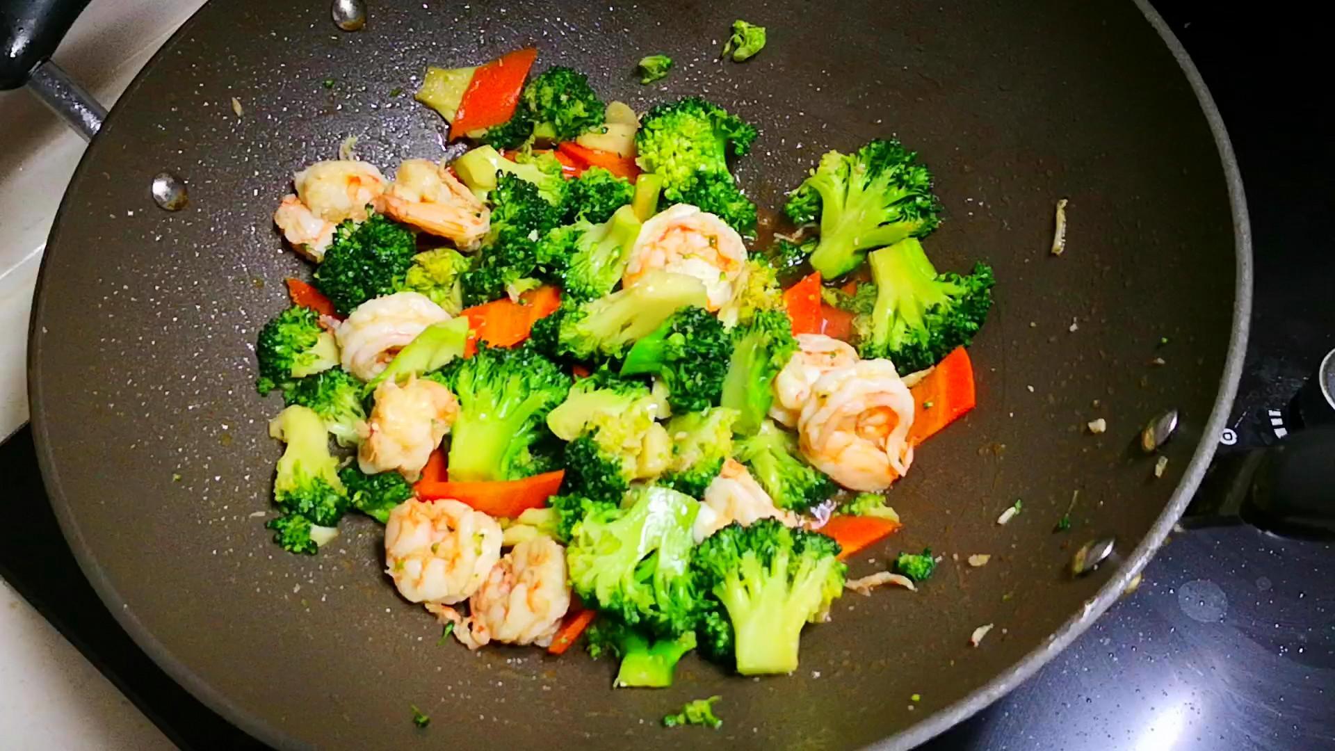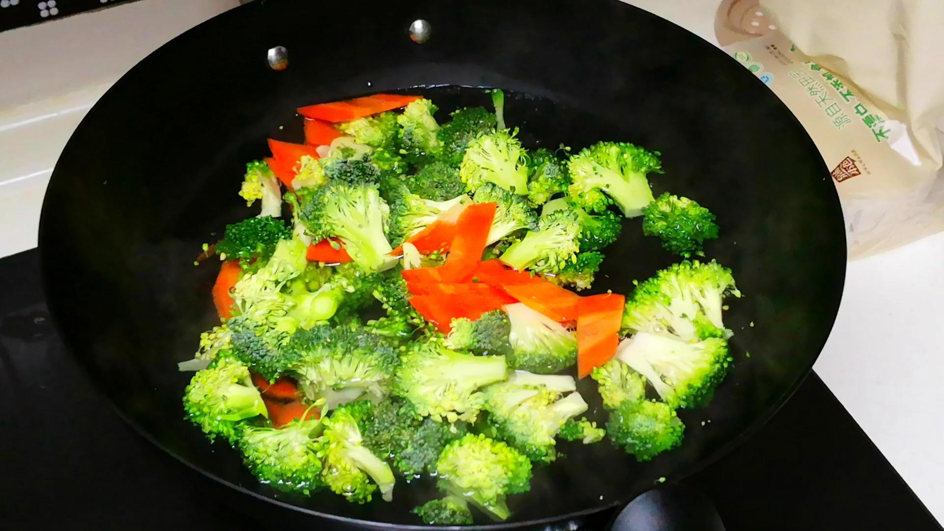 3、起鍋加油,油溫五成熱放入蒜片,蒜片爆炒出香味後倒入蝦仁,轉中火翻炒,炒蝦仁時油溫很重要,如果用大火炒,油溫過高炒出的蝦仁就會幹乾癟癟肉質老硬不鮮嫩;如果用小火炒,蝦仁就會很容易脫漿,而且炒出的蝦仁半生不熟,口感不香。蝦仁炒至變紅後放入西蘭花和胡蘿蔔片繼續翻炒,翻炒均勻再後加入一匙鹽、一匙白糖,適量的生抽和蠔油,翻炒均勻後即可出鍋,美味即成!