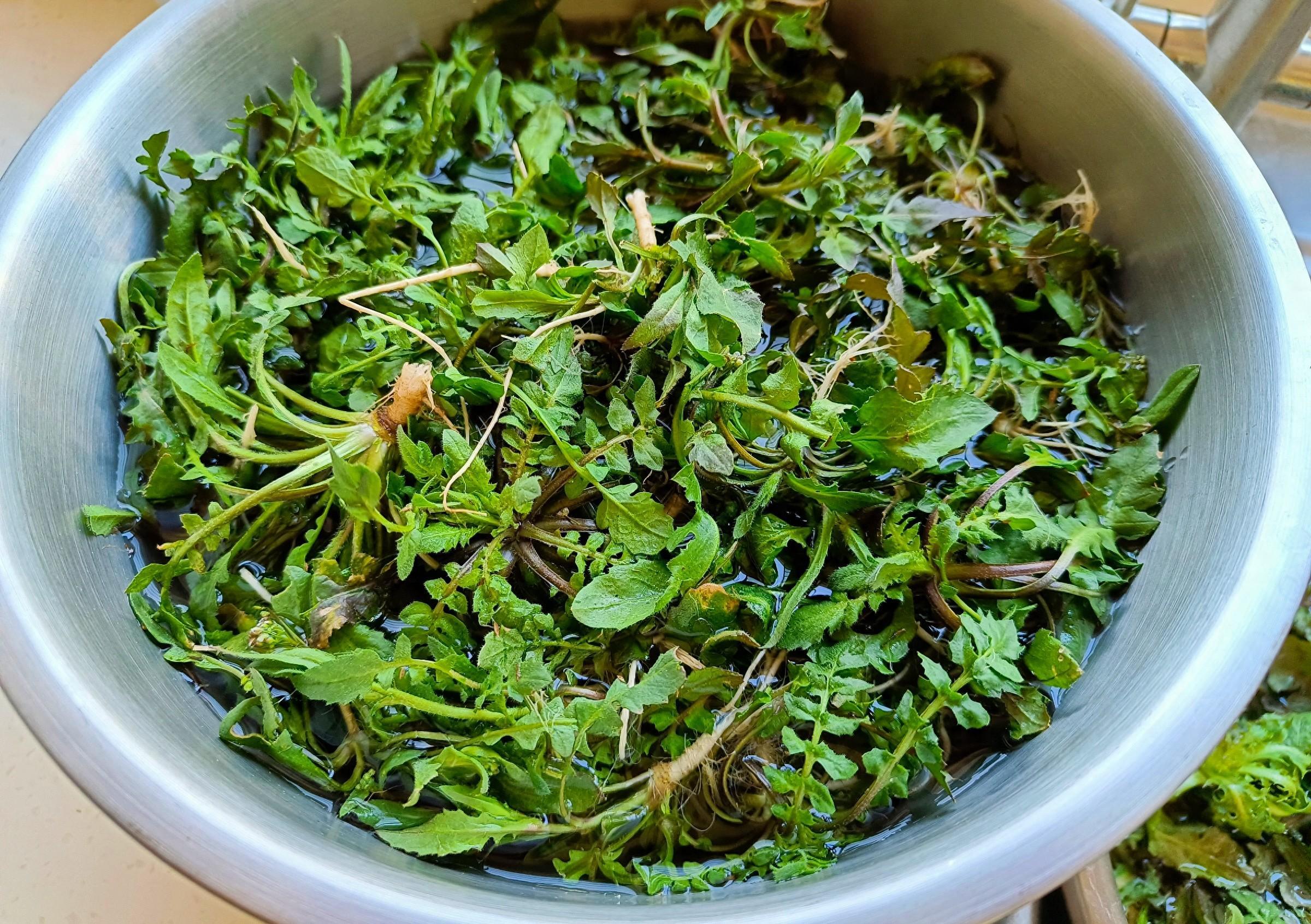 1.先把薺菜摘乾淨,摘薺菜是個慢活,急不得,一簍子薺菜我和老媽摘了一下午才摘乾淨。然後再把薺菜放到清水中浸泡15~20分鐘,經過浸泡後,薺菜根和葉上的泥土就會很容易清洗掉了。浸泡的時候加上2勺食鹽,可以殺菌、殺蟲卵。