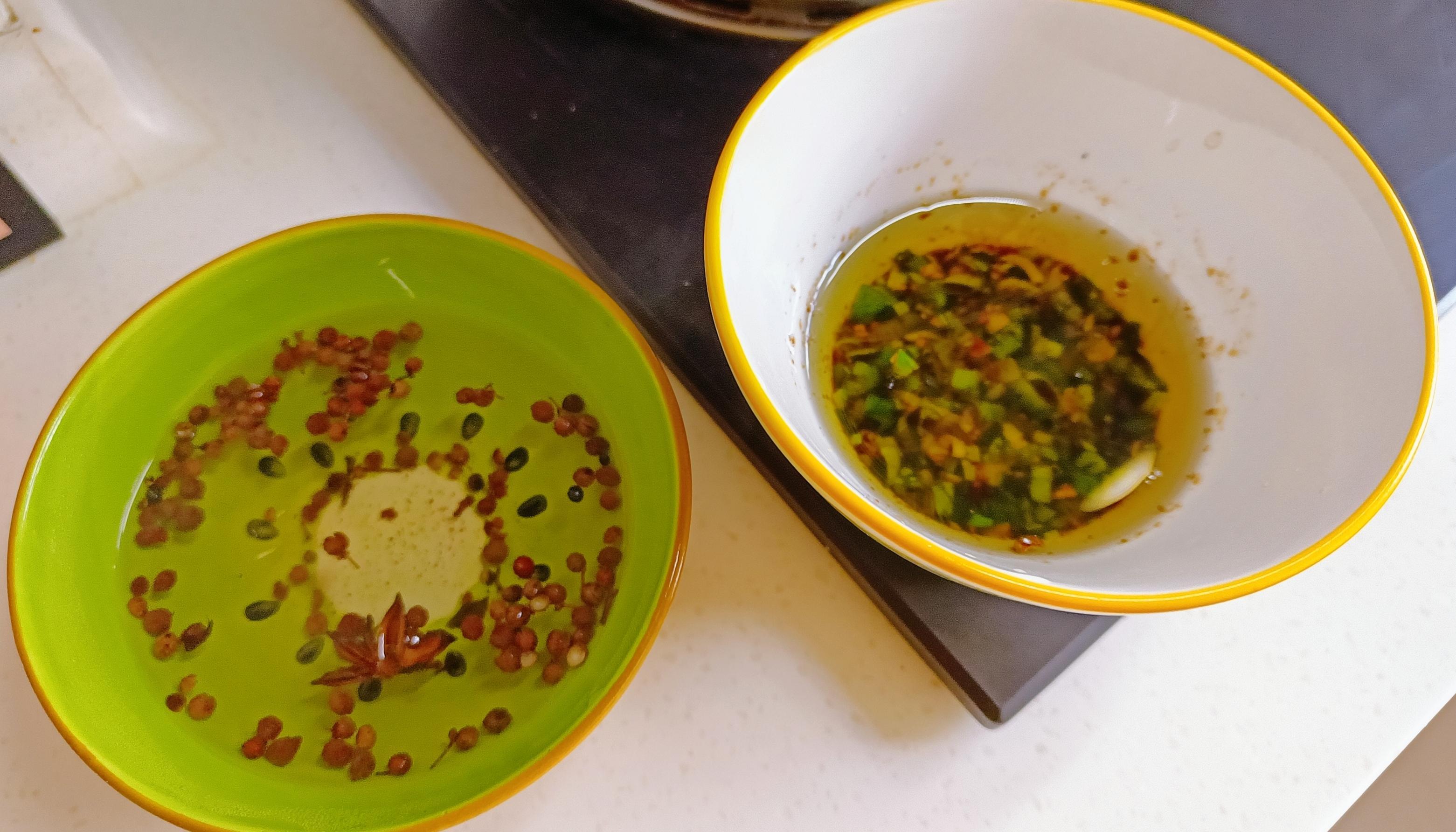 3.取一個小碗,加入一把花椒、一個八角,再倒入半碗熱水浸泡20分鐘後,撈出花椒和八角,留下花椒水備用;再取一個小碗,分別加入3勺生抽、1勺花椒粉、一小勺食鹽、適量的蔥花和薑末,再倒入剛剛燒開的熱油,激發出香味後放一邊備用。