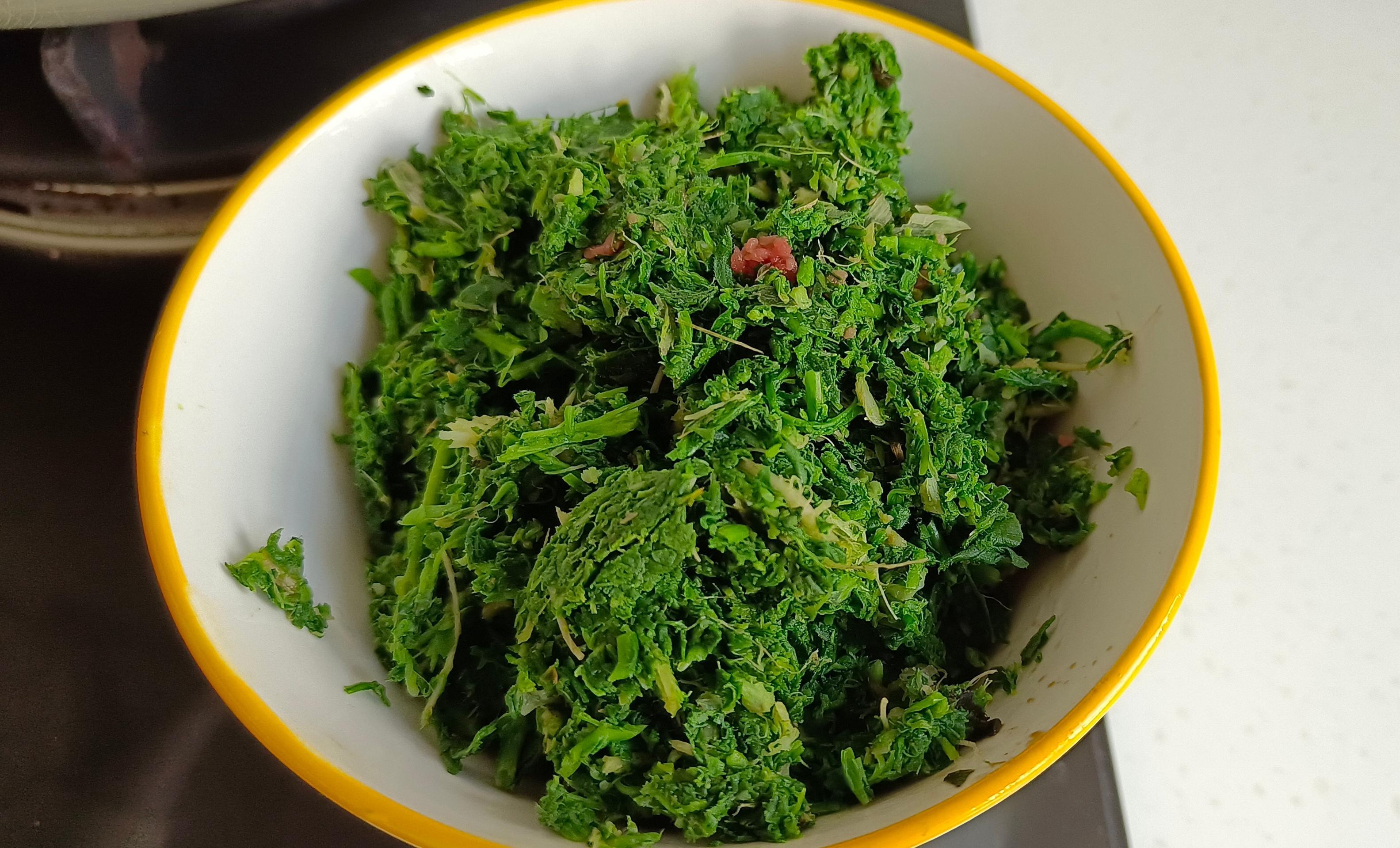2.提前燒一鍋開水,水開的時候滴入幾滴食用油,可以使薺菜的顏色保持翠綠、不發黑,然後開大最大火,燒至水滾開後再放入薺菜,如果薺菜較多,要分鍋焯湯,薺菜焯燙時間不宜過久,大約15~20秒,看到薺菜變色後即可撈出,然後快速放到冷水中過涼,這樣可以保持薺菜脆嫩的口感。然後再撈出薺菜擠乾淨水分後切碎剁細備用。